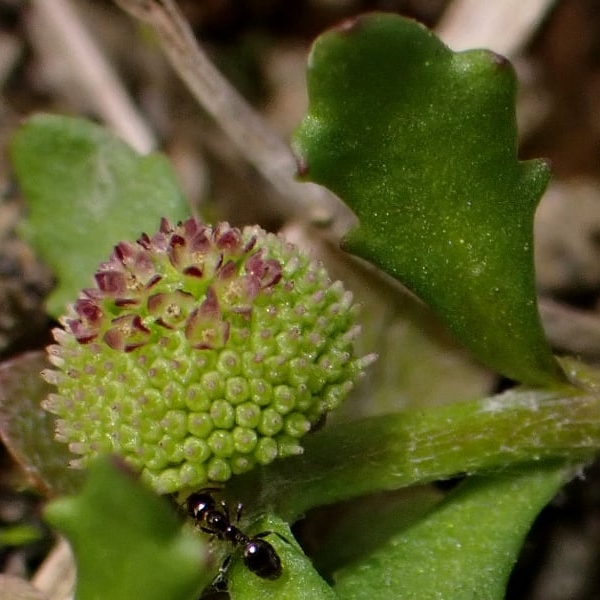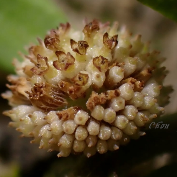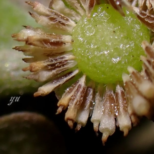 ![]() 上面照片:周佩玉拍攝 (一年生匍匐性草本;莖節生根;單葉互生,倒長卵形,上部邊緣具2~3枚不規則的疏齒,無柄;頭狀花序,扁球形,單生於葉腋,直徑不到0.5公分,無花序梗或極短) |