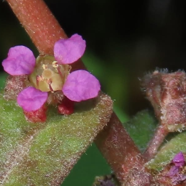![]() 上面照片:小花老師拍攝 (聚繖花序,腋生,具總花梗;花瓣4~5枚,桃紅色;雄蕊4枚) |