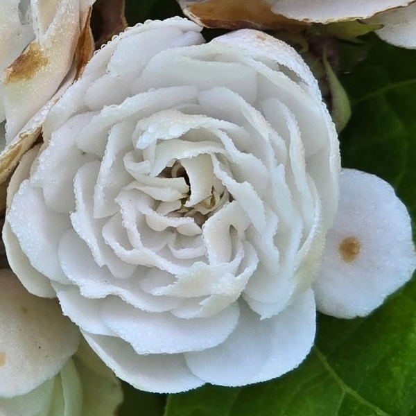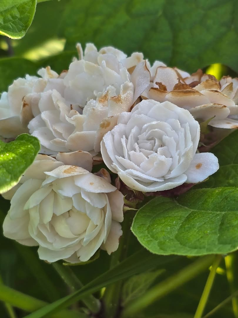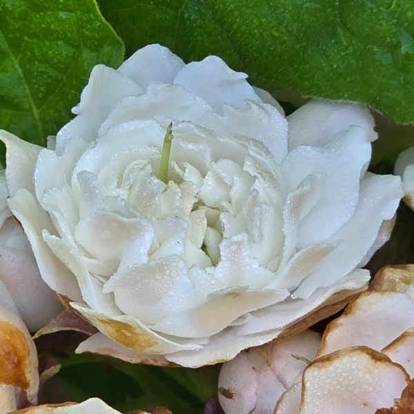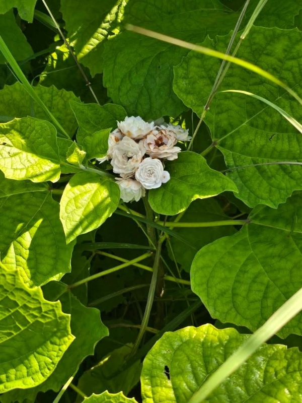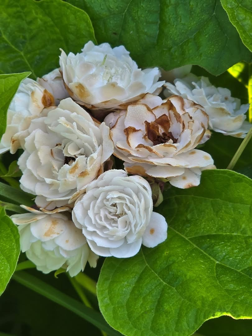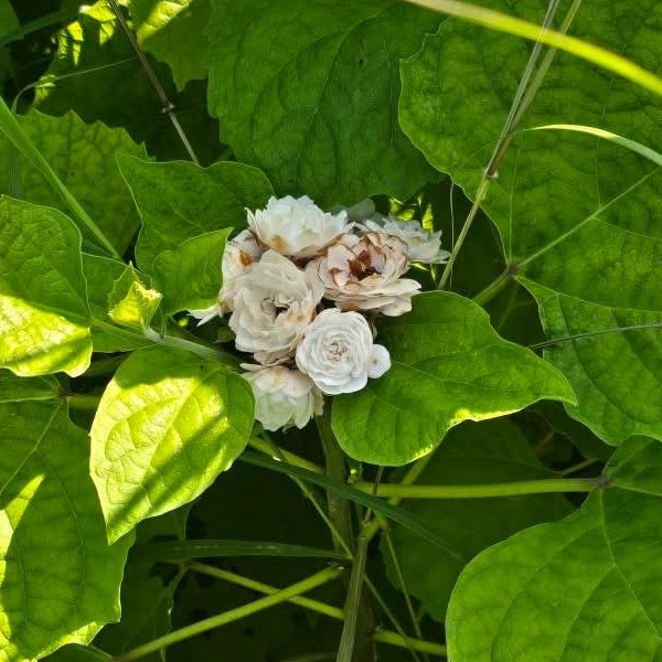 (歸化種;台灣物種名錄標名臭茉莉;維基百科標名重瓣臭茉莉,標示臭茉莉是重瓣臭茉莉之變種,學名為 Clerodendrum chinense var. simplex;世界植物在線 POWO 標示 Clerodendrum chinense var. simplex = Clerodendrum chinense,皆為有效學名,附有照片(相符);常綠灌木;單葉對生,卵圓形,先端銳尖,基部心形,全緣或不齊波狀齒牙緣;聚繖花序,密生,頂生;花多數,白色或先端略帶淡紫色,重瓣(雄蕊常變成花瓣而形成重瓣),形態上與重瓣茉莉花相似;具草腥味;核果球形,罕見結果)
