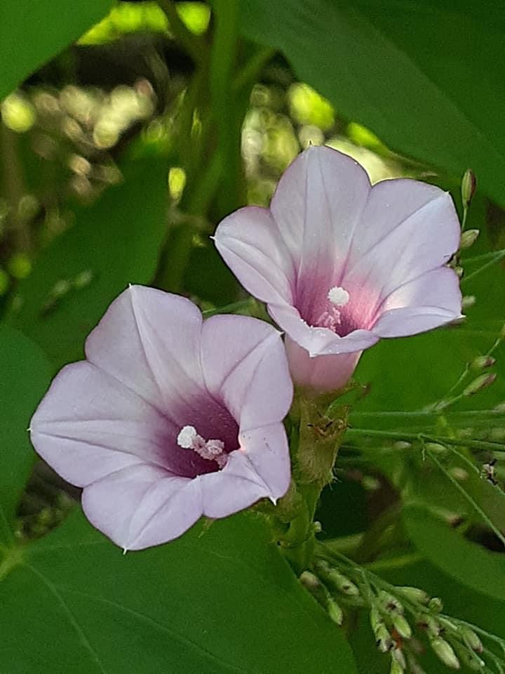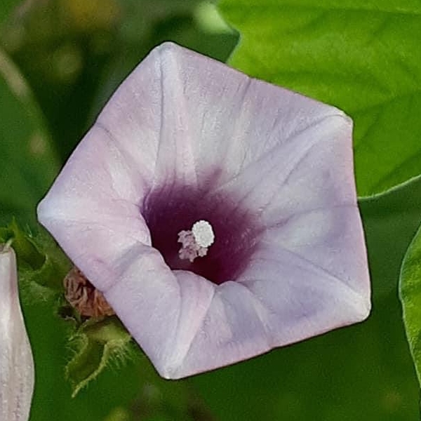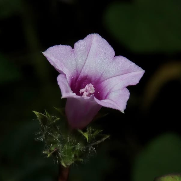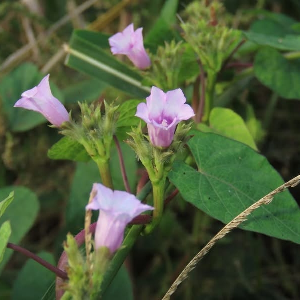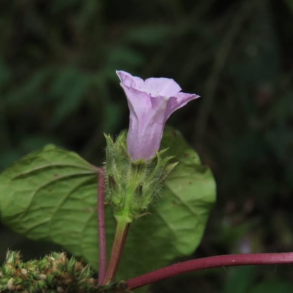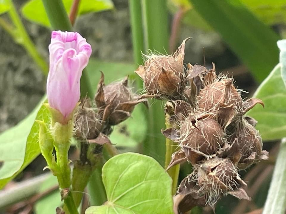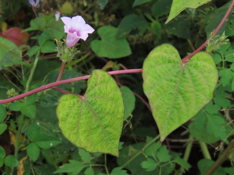 (歸化種;維基百科標名三裂葉薯,別名小花假番薯、紅花野牽牛;纏繞性草質藤本;單葉互生,心形至3淺裂;聚繖花序,腋生,1至數朵,粉紅至紫紅色,為最小型的牽牛花,萼片披針形,密被長毛;蒴果球形,密被長毛;花朵壽命3~7天,一般牽牛花為1天)