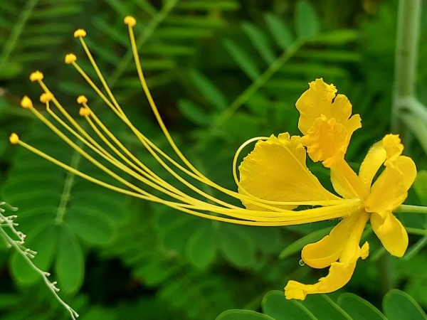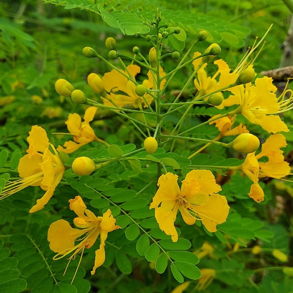 (栽培種;原生於中美洲;台灣物種名錄標名紅蝴蝶,別名洋金鳳、番蝴蝶、金鳳花、蛺蝶花、黃蝴蝶,附有照片;維基百科標名紅蝴蝶;花色並非只有紅色,至少還有黃色,別名紅蝴蝶或黃蝴蝶似乎不妥,可合稱為蛺蝶花;灌木;二回羽狀複葉,互生;總狀花序,頂生;莢果,刀形)