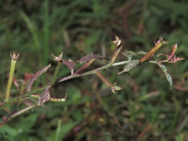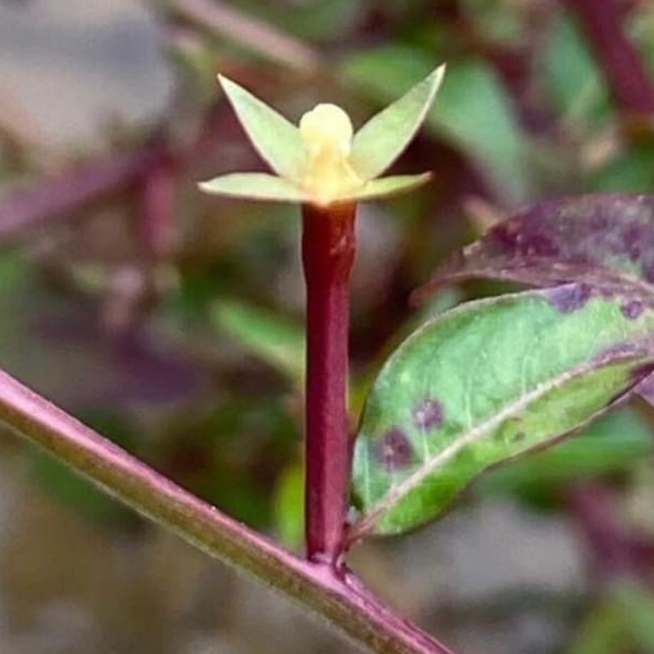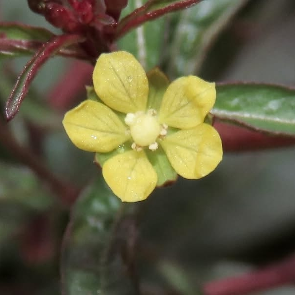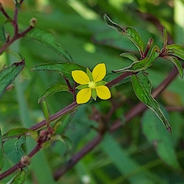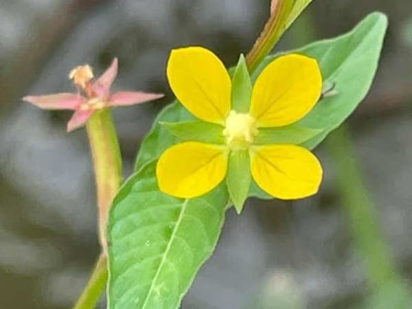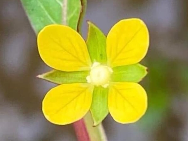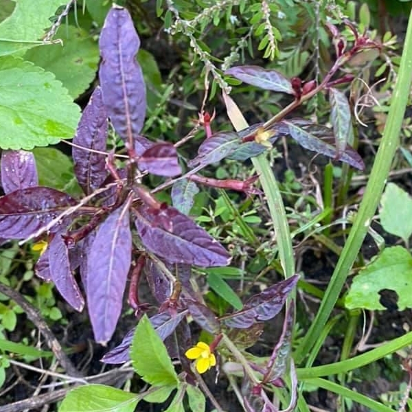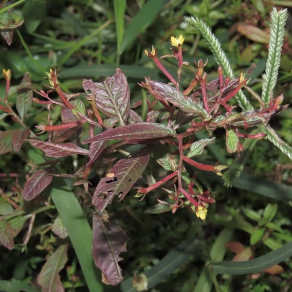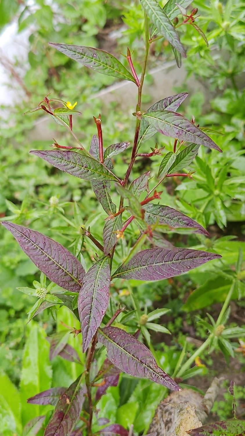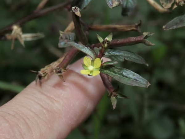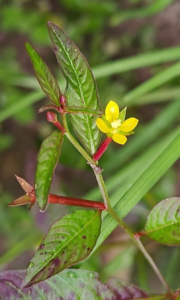 (歸化種或原生種;世界植物在線 POWO 標示原生於中南美洲及澳洲,附有照片(相符);維基百科標名草龍,別名細葉水丁香,附有照片(相符);台灣物種名錄標示為原生種;一年生直立草本;莖方柱形;幼株具有細毛;單葉互生,長橢圓形、長卵形至披針形,葉子大小變化大;在日照不足的地方,全株常呈紅色;花朵單生葉腋,花徑甚小;花瓣4枚,黃色,橢圓形;雄蕊8枚貼著雌蕊,雌蕊柱頭球形,淡黃色;花萼4枚;果實細長,長圓柱形(上部1/5~1/3增粗),紅色,近無柄,萼片宿存)