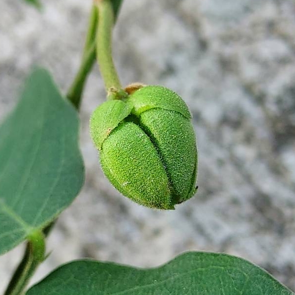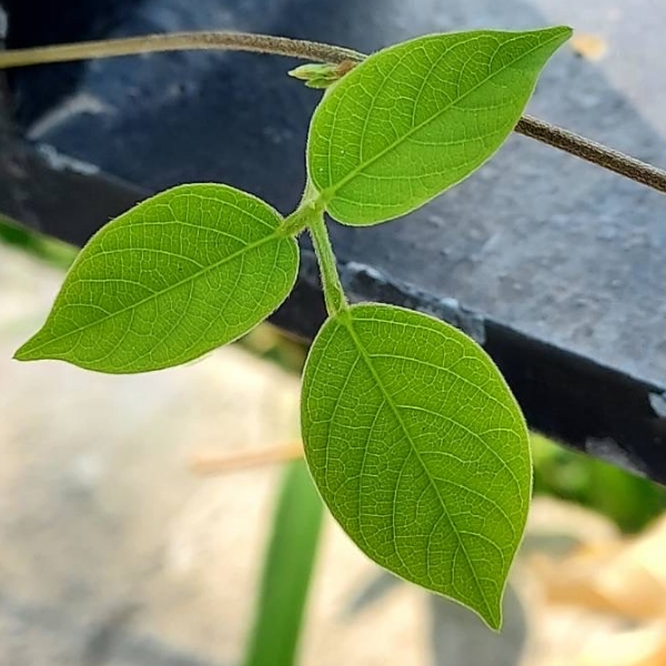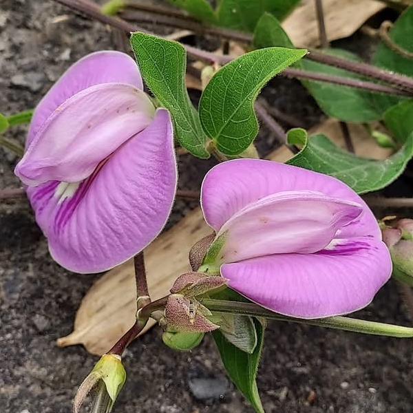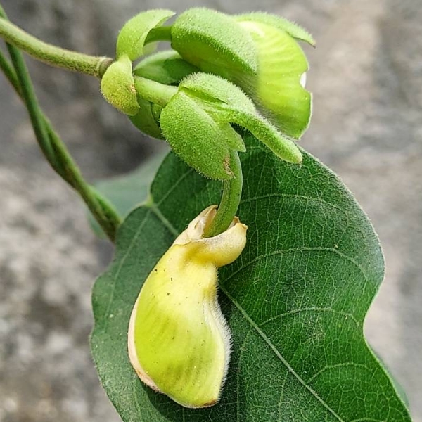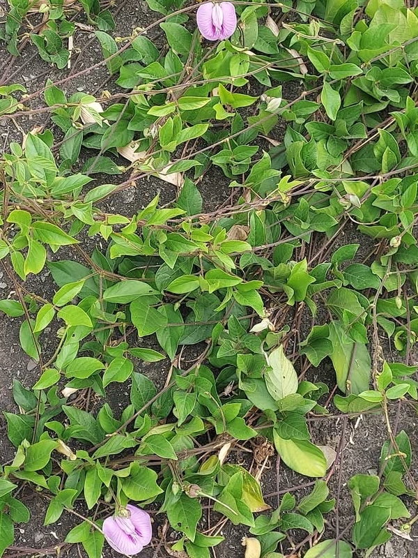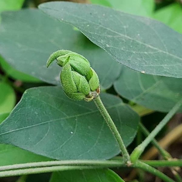 (歸化種;原生於中南美洲;多年生纏繞性草本;全株被短毛;三出複葉,互生;小葉卵形至長卵形,全緣;總狀花序,腋生;花冠蝶形,粉紫色至白色;莢果線形,扁平)