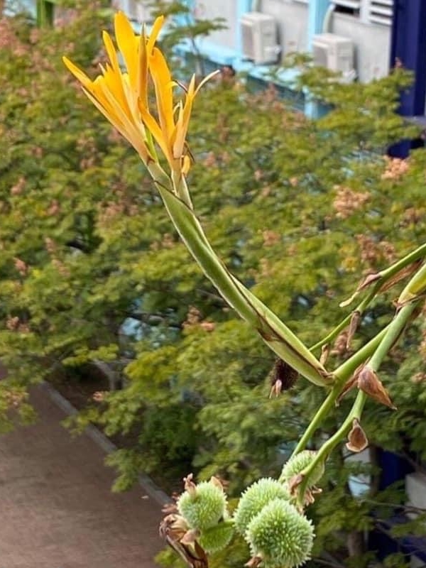 (歸化種;原產於中、南美洲一帶;多年生草本;根莖塊狀;單葉互生,長橢圓形,全緣;總狀花序,具苞片;花瓣有紅、黃、白...等色;蒴果卵形,3瓣狀,表面具小軟刺,成熟黑褐色;蒴果內含種子5~15枚,種子球形,成熟黑色,堅硬;根莖可食用)