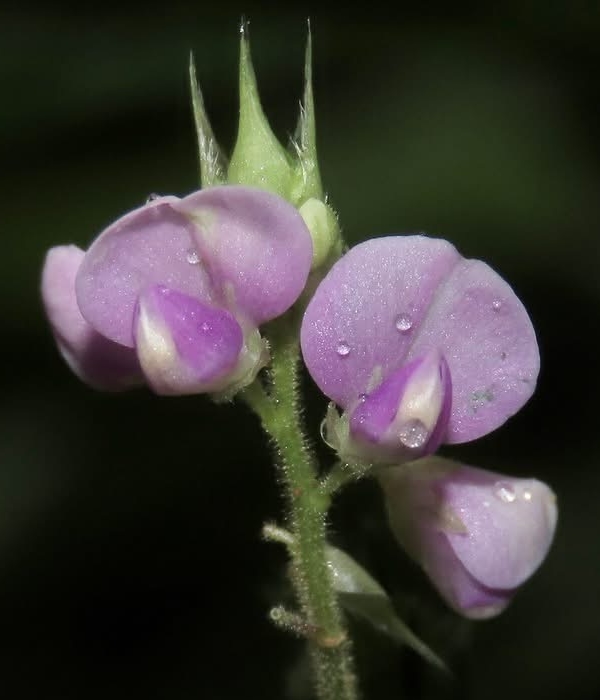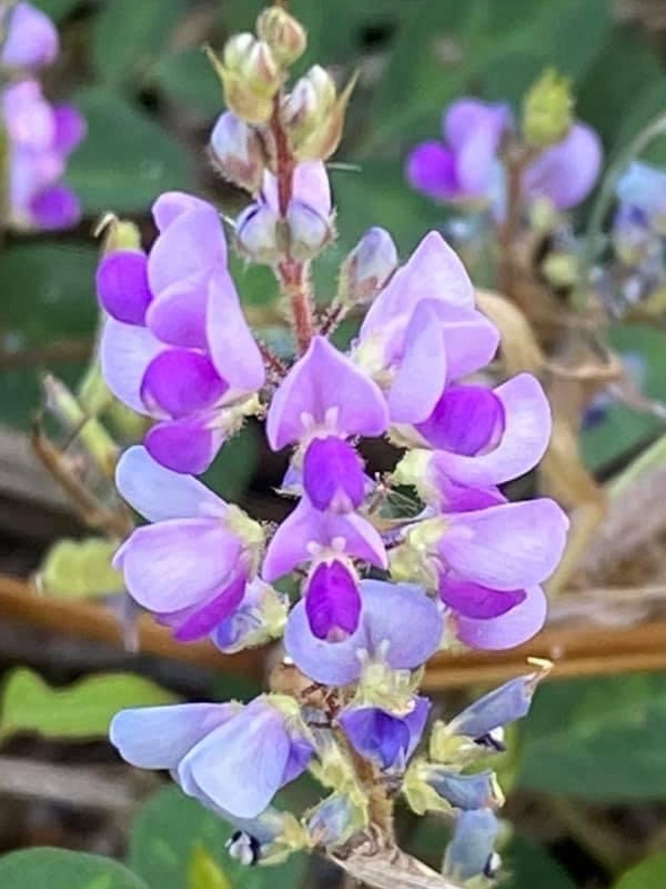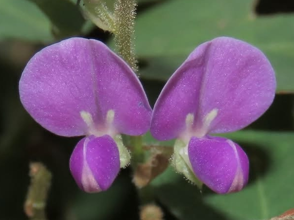 (原生種;原生於日本、印度和澳洲的三角區域;世界植物線 POWO 標示學名 Grona heterocarpos,附有照片;台灣物種名錄標名假地豆,標示學名 Grona heterocarpa、Grona heterocarpa subsp. heterocarpa;半灌木;植株匍匐或斜生;枝條密被伏毛;三出複葉,互生;小葉橢圓形至倒長卵形,葉面有斑,葉背灰白色;總狀花序,頂生;花冠粉紅色至藍紫色;莢果4~7節,成熟後斷裂成一節一粒種子的節莢)