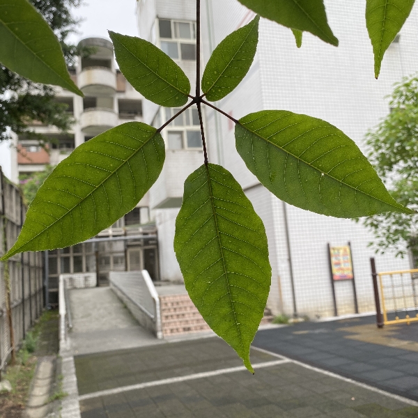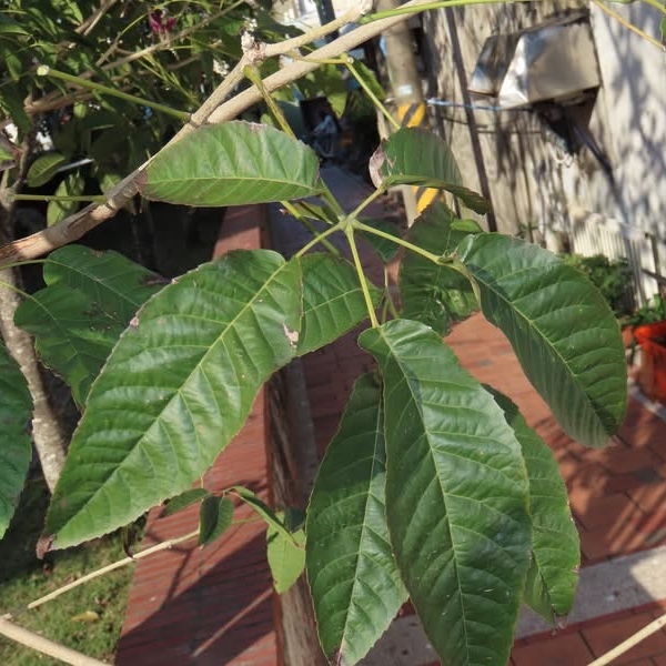 ![]() 上面照片:小花老師拍攝 (掌狀複葉,互生;小葉5枚,鋸齒緣) |