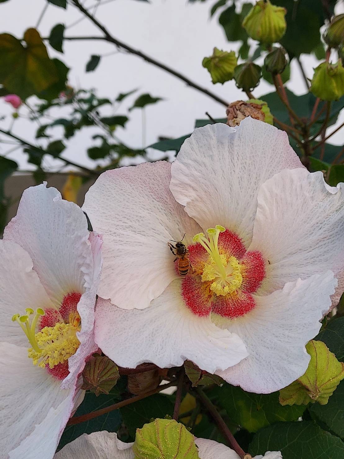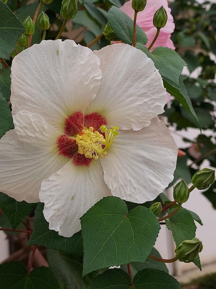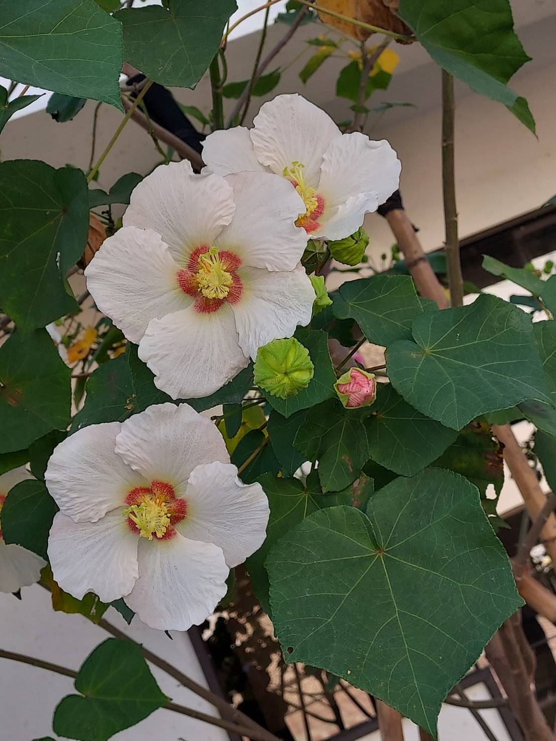 ![]() 上面照片:陳維琪拍攝 (花瓣5枚,近圓形,白色,近凋謝時轉為粉紅色;花瓣基部紅色至粉紅色) |