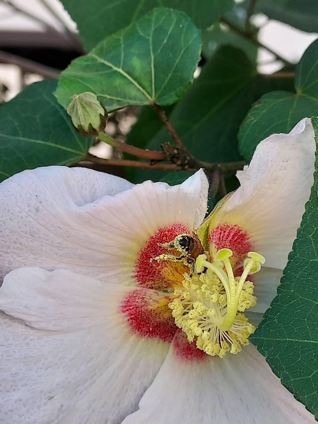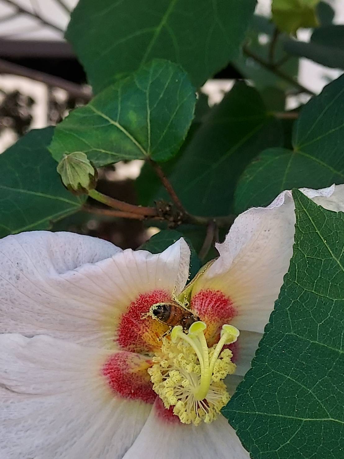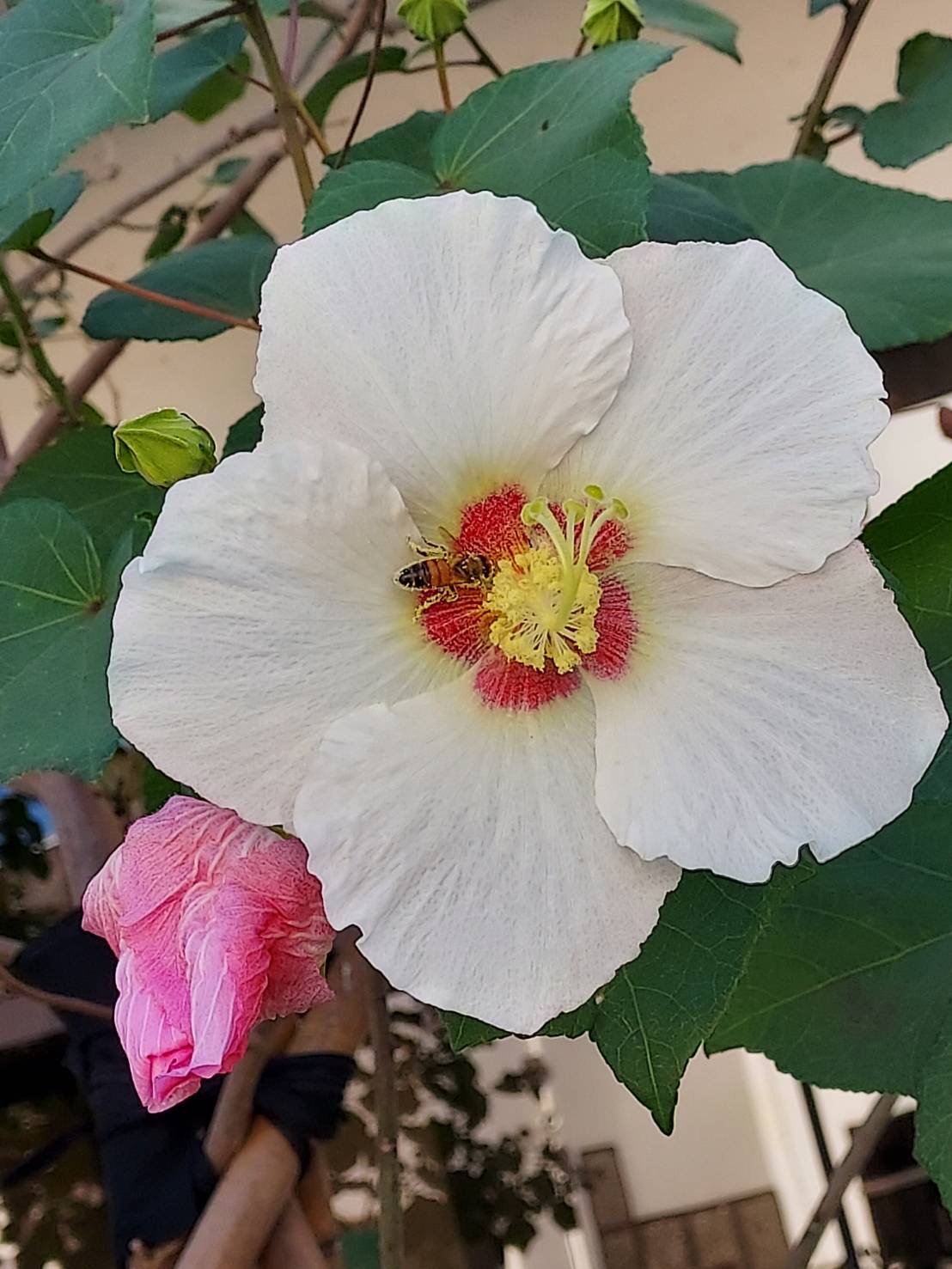 ![]() 上面照片:陳維琪拍攝 (花瓣5枚,近圓形,白色,近凋謝時轉為粉紅色;花瓣基部紅色至粉紅色) |