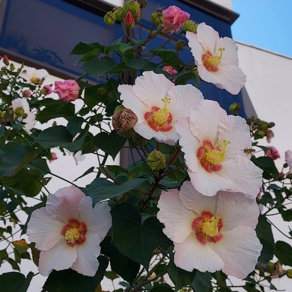 ![]() 上面照片:潘玉郎拍攝 (花瓣5枚,近圓形,白色,近凋謝時轉為粉紅色;花瓣基部紅色至粉紅色) |