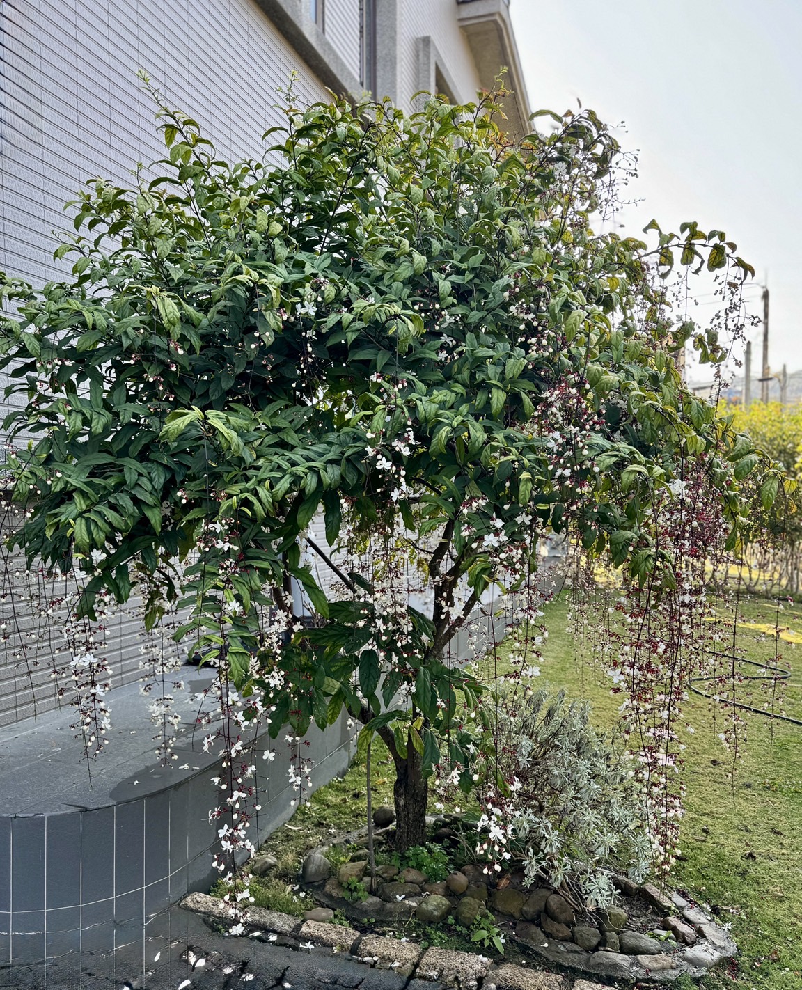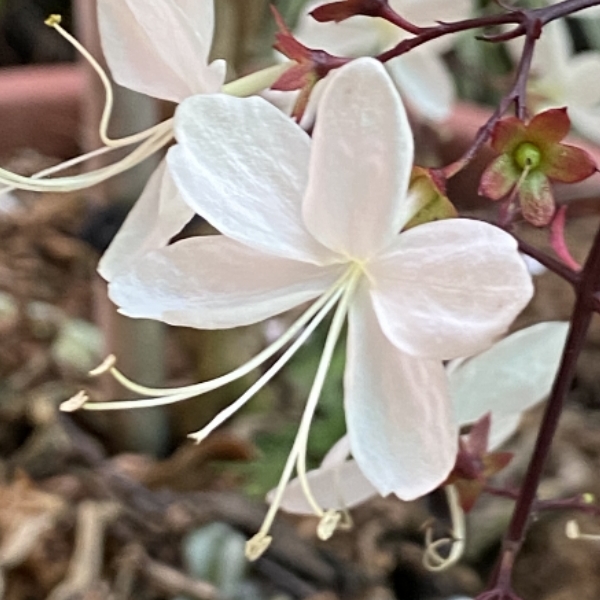 (栽培種;原生於中南半島;台灣物種名錄20240815尚未登錄此學名及中文名;灌木;株高可達3公尺以上;主枝末端及側枝柔軟下垂;單葉對生,長橢圓形至橢圓狀披針形,全緣,略帶波浪狀;圓錐花序,自莖端伸出下垂,長達可達50公分;花萼5枚,多呈紅褐色;花冠長筒狀;花瓣5枚,白色;雄蕊4枚,雌蕊單一,細長狀;果實扁球形;花萼宿存呈紅色)
