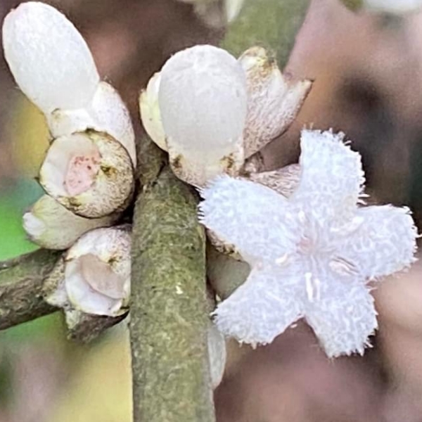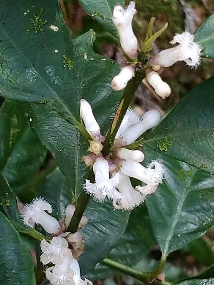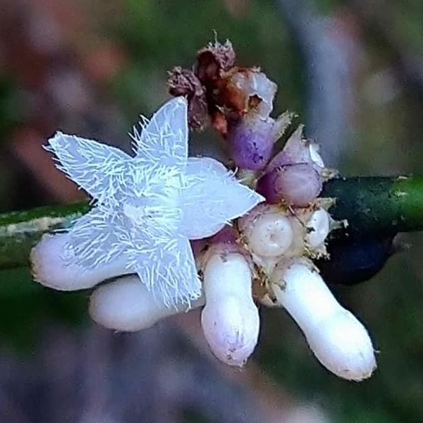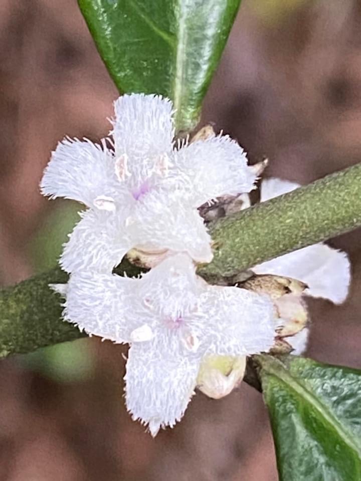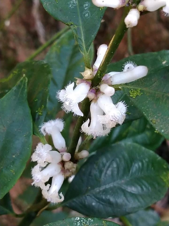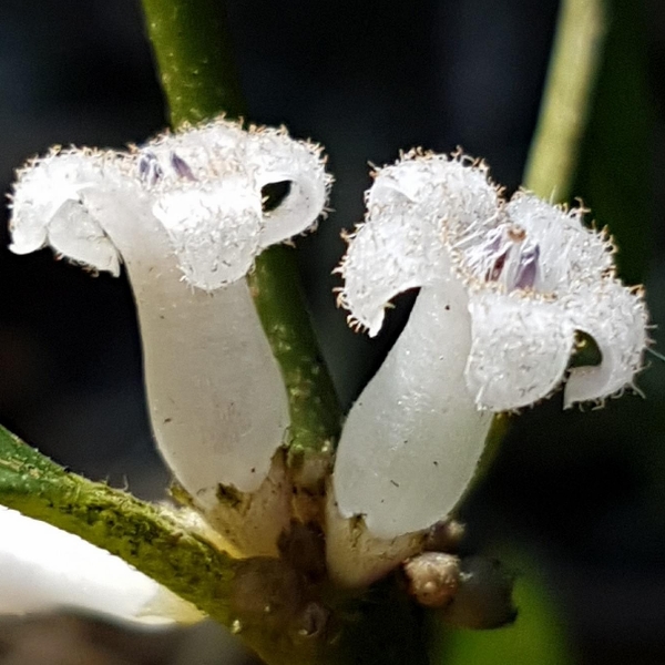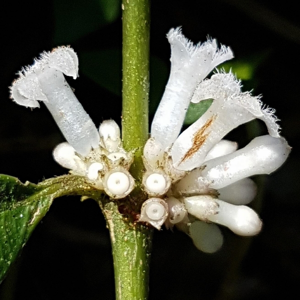 ![]() 上面照片:鄭演義拍攝 (花朵簇生於葉腋;花冠筒狀,花瓣5枚,白色至粉紫色,上面密被毛) |