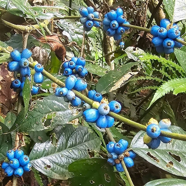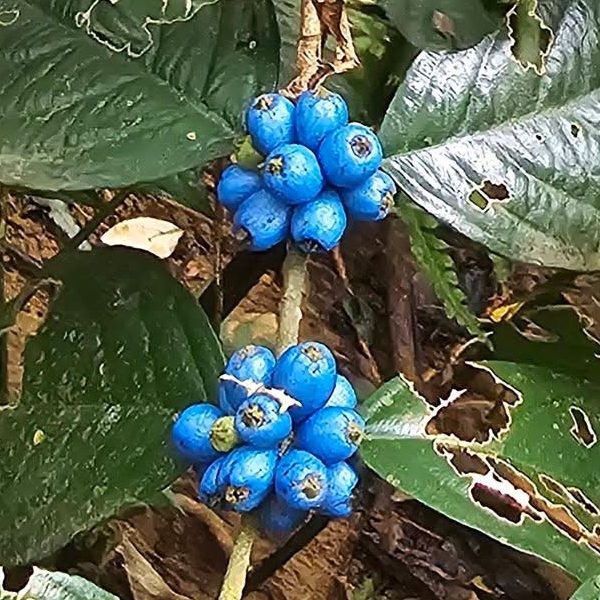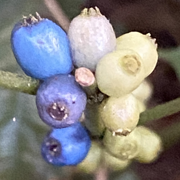 ![]() 上面照片:潘玉郎拍攝 (莖條從光滑無毛至密被短伏毛皆有;果實倒卵形,成熟藍色) |