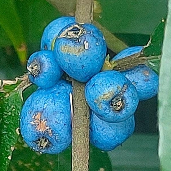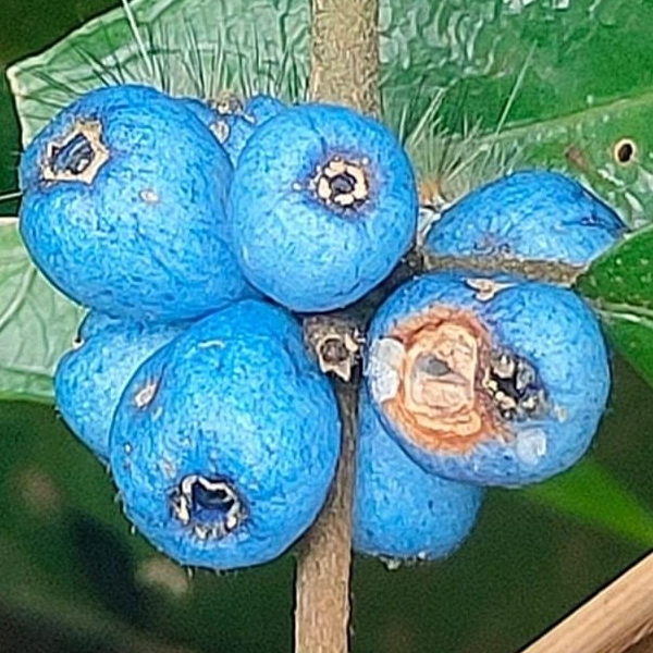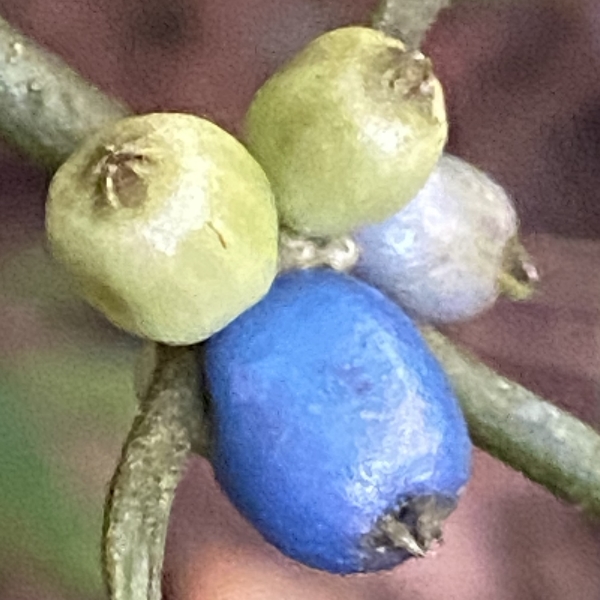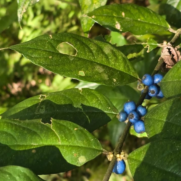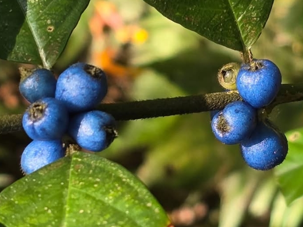 ![]() 上面照片:潘玉郎拍攝 (莖條從光滑無毛至密被短伏毛皆有;單葉對生,長橢圓形,具短柄;果實倒卵形,成熟藍色) |