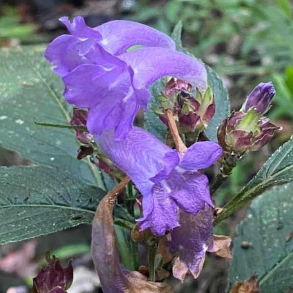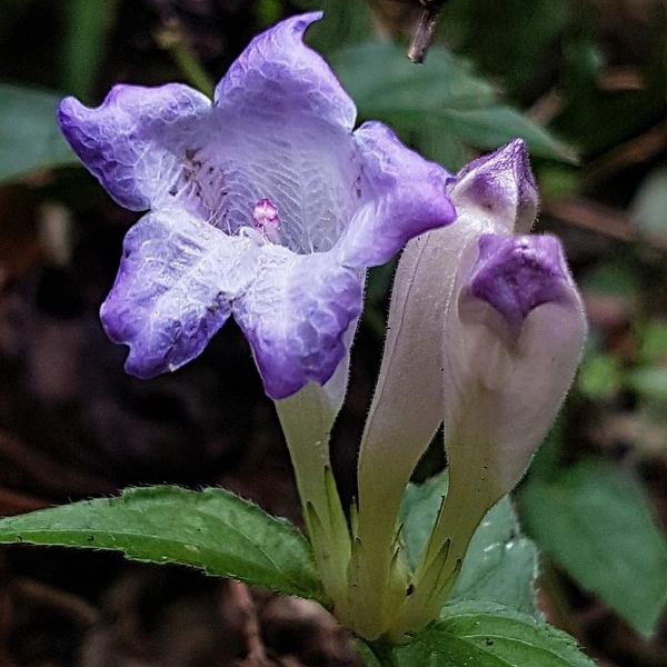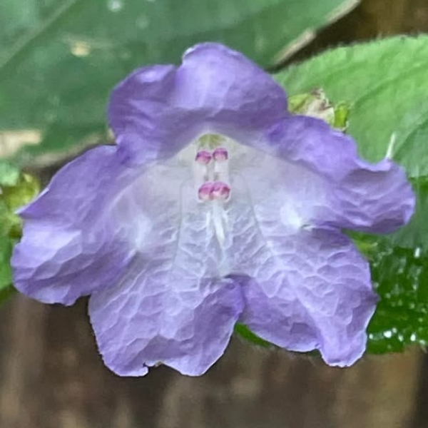 ![]() 上面照片:潘玉郎拍攝 (半灌木;全株被毛;單葉,十字對生,長橢圓形,鋸齒緣,先端漸尖,具緣毛,上下表面密被粗毛;聚繖花序,腋生或頂生;花冠筒狀,花瓣5枚,藍紫色) |