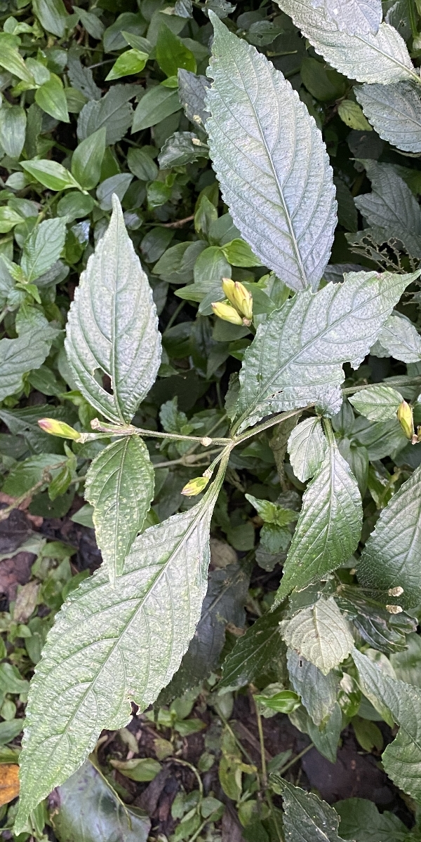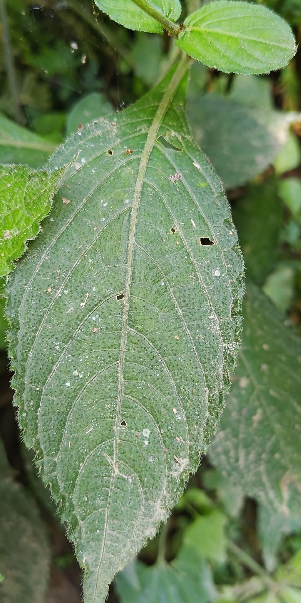 ![]() 上面照片:林美燕拍攝 (單葉,十字對生,長橢圓形,鋸齒緣,先端漸尖,具緣毛,上下表面密被粗毛 ;腋生開花枝的葉片為橢圓形,先端鈍圓,無柄) |