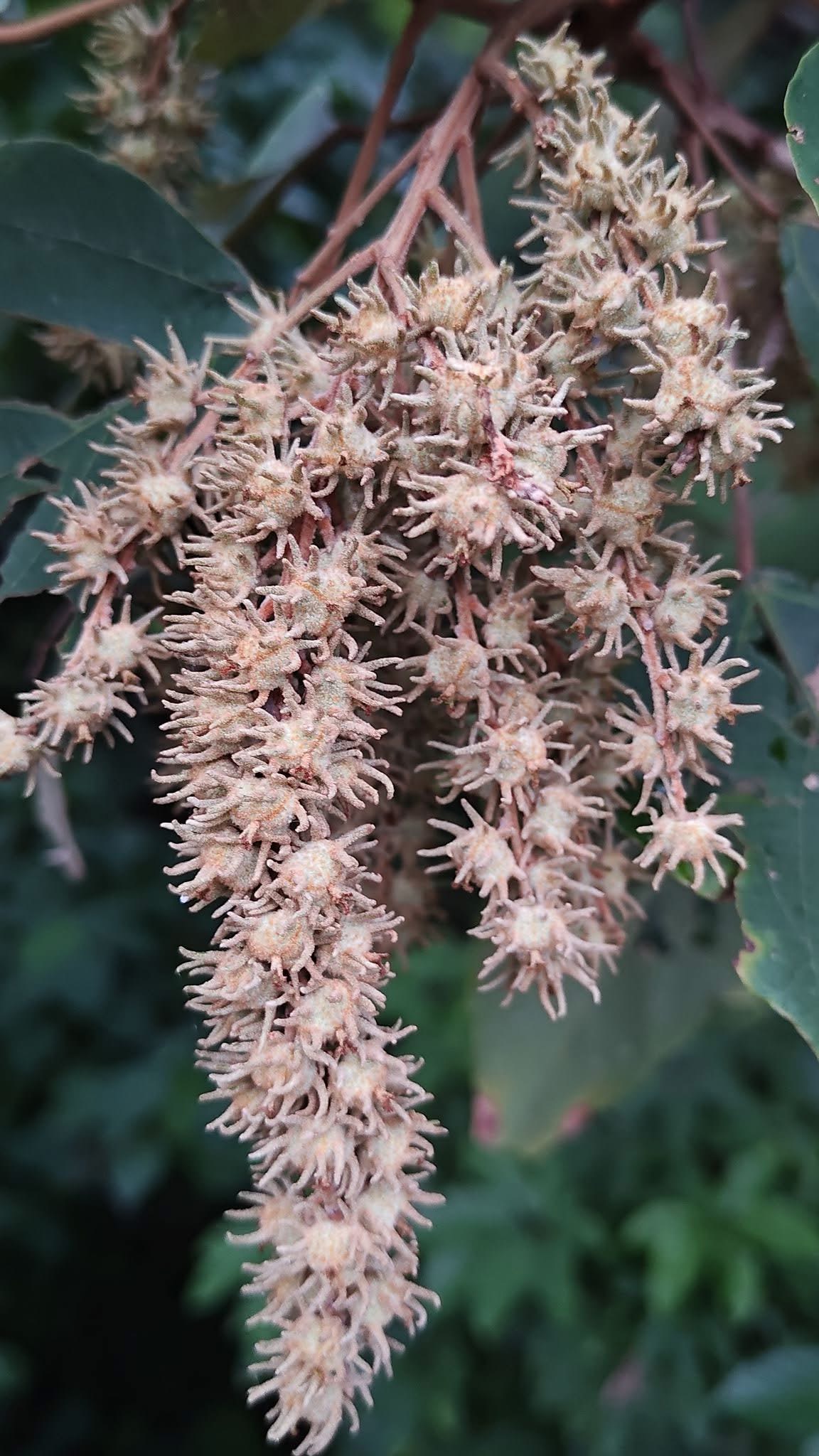 ![]() 上面照片:林美燕拍攝 (花單性,雌雄異株;總狀花序,腋生或頂生,或呈圓錐狀排列(雄花序的花較多且密集);花序軸密被黃褐色星狀毛;雌花具短梗,無花瓣,柱頭3叉,花萼3枚;雄花梗較雌花長,雄蕊多數,無花瓣,花萼3枚;蒴果球形,表面密被長軟刺) |
