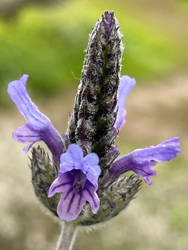 ![]() 上面照片:張儷蓁拍攝 (全株密被白色短毛;穗狀花序(1~3穗),頂生,花梗特長;唇形花,紫色,上唇比下唇大許多,花瓣具深紫色縱紋) |