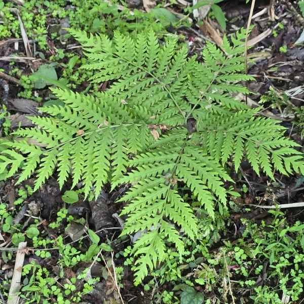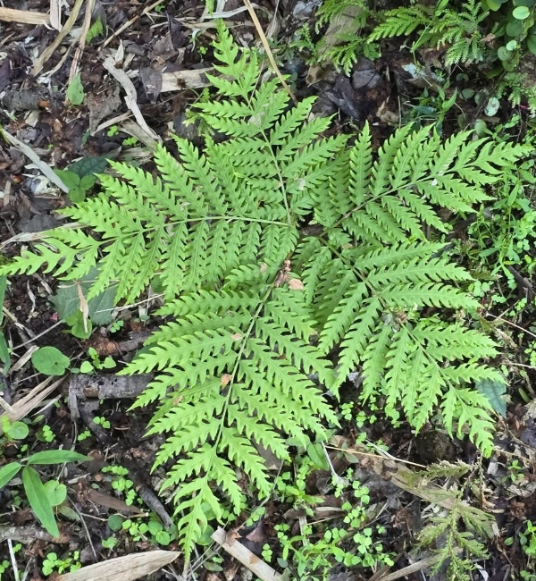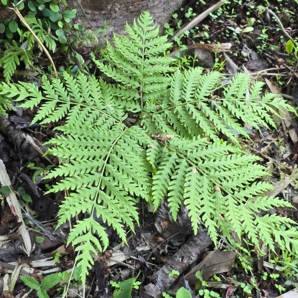 (原生種;原生於台灣、日本、中國大陸至新幾內亞一帶;世界植物在線 POWO 標示 Pteris wallichiana = Pteris longipes,皆為有效學名;株高可達2公尺以上;三回羽狀複葉深裂(首回呈掌狀),叢生;孢子囊生於葉背邊緣呈長線形)
