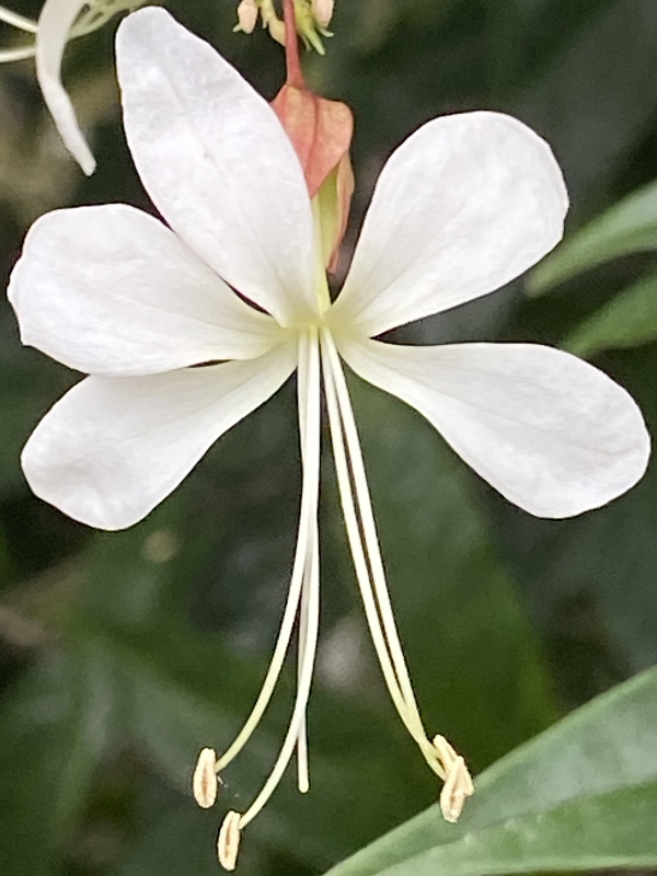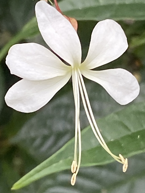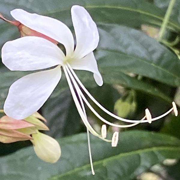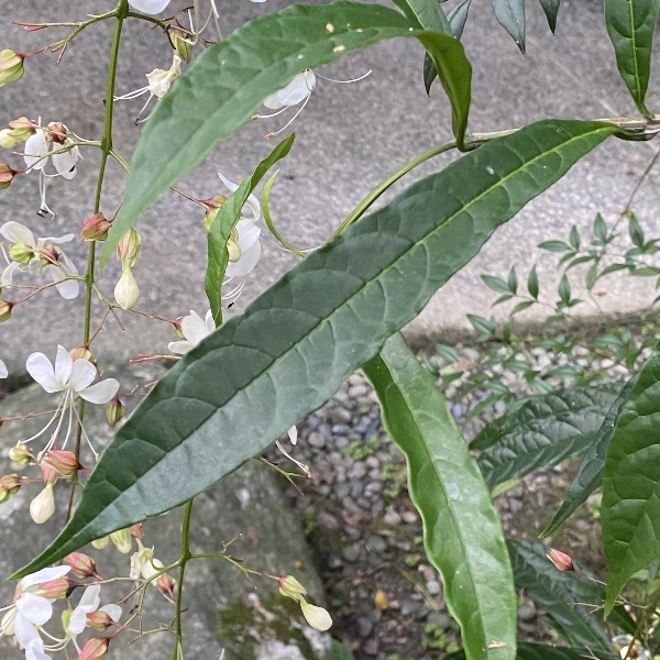(栽培種;原生於中國大陸至印度一帶;世界植物在線 powo 標示 Clerodendrum wallichii = Clerodendrum laevifolium,皆為有效學名,附有照片(相符);維基百科標名垂茉莉;台灣物種名錄20240815尚未登錄此學名及中文名;灌木(高度可達3公尺以上);單葉對生,長橢圓形至狹長橢圓形,全緣,葉緣略帶波浪狀;圓錐花序,頂生,呈下垂狀;花瓣5枚,雄蕊4枚,花絲細長;花萼多呈綠色,或帶褐紅色;果實球形,成熟紫黑色;花後萼片增厚呈鮮紅色至紫紅色)