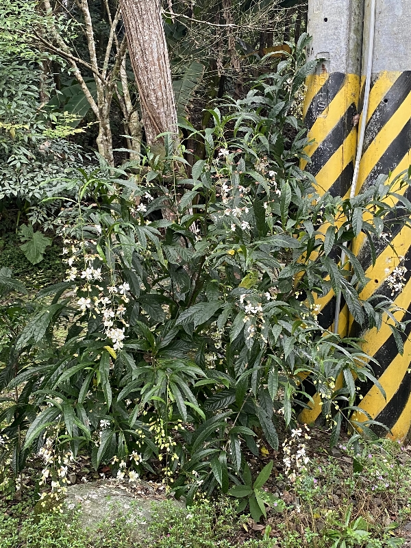 ![]() 上面照片:蟹老闆拍攝於宜蘭縣員山鄉望龍埤 (灌木(高度可達3公尺以上);單葉對生,長橢圓形至狹長橢圓形,全緣,葉緣略帶波浪狀;圓錐花序,頂生,呈下垂狀) |