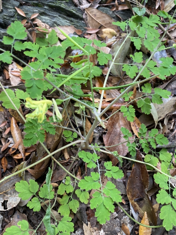 (原生種;原生於台灣、日本、中國大陸和越南一帶;世界植物在線 POWO 標示 Corydalis tashiroi = Corydalis balansae,皆為有效學名;台灣物種名錄標名臺灣黃菫,別名台灣黃堇、台灣黃菫;二年生草本;2~3回羽狀複葉,互生;小羽片3~5對,近對生;小葉卵形,圓齒緣至掌狀;總狀花序,與葉對生;具苞片,苞片卵形至長卵形;花冠黃綠色至黃色,花距長於花梗;蒴果平直,前端細尖)