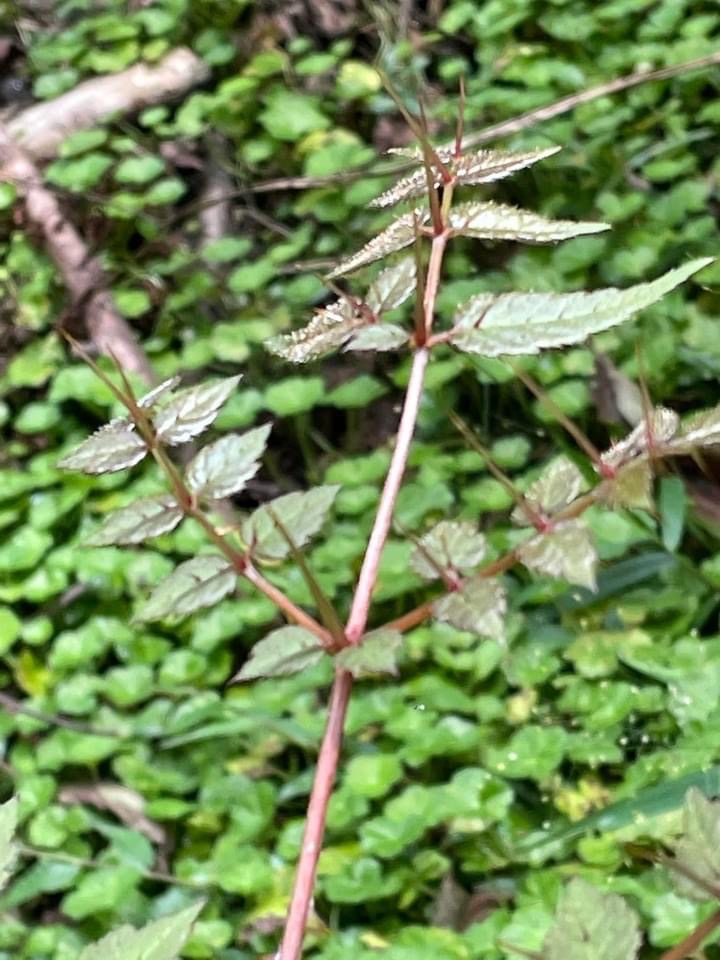 ![]() 上面照片:張儷蓁拍攝 (二回羽狀複葉,互生;小羽片對生,4~5對,基部具一對小葉;小葉對生,卵形至披針形,鋸齒緣,近無柄,葉軸有棘刺,節刺特長;葉軸或呈紫紅色) |