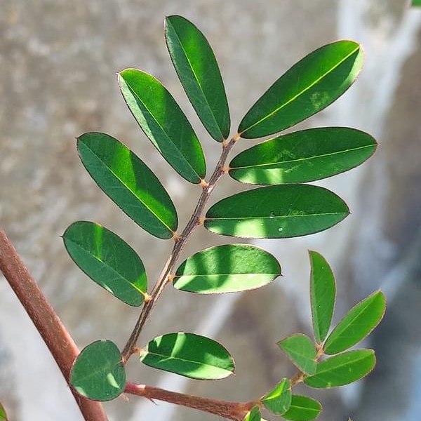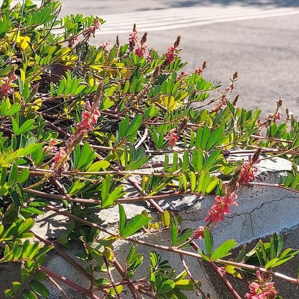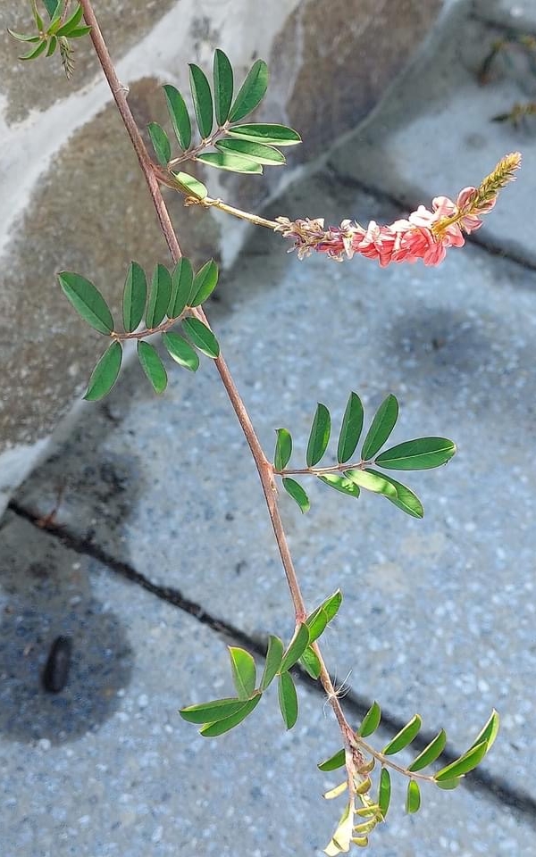 (原生種;原生於台灣、中國大陸至非洲一帶;台灣物種名錄標名穗花木藍;一年生草本;莖條常呈紅色(不一定紅色);全株被伏毛;羽狀複葉,互生;小葉互生,9~11枚,