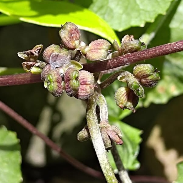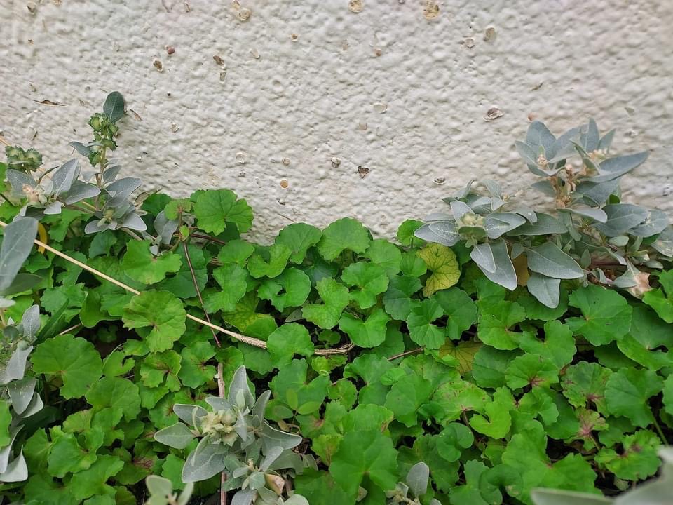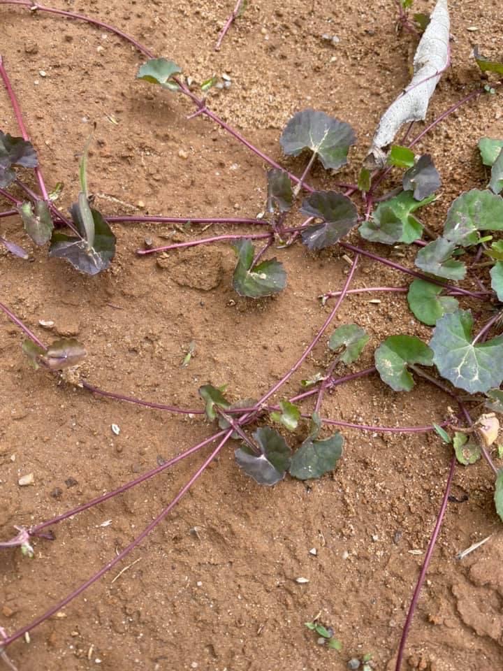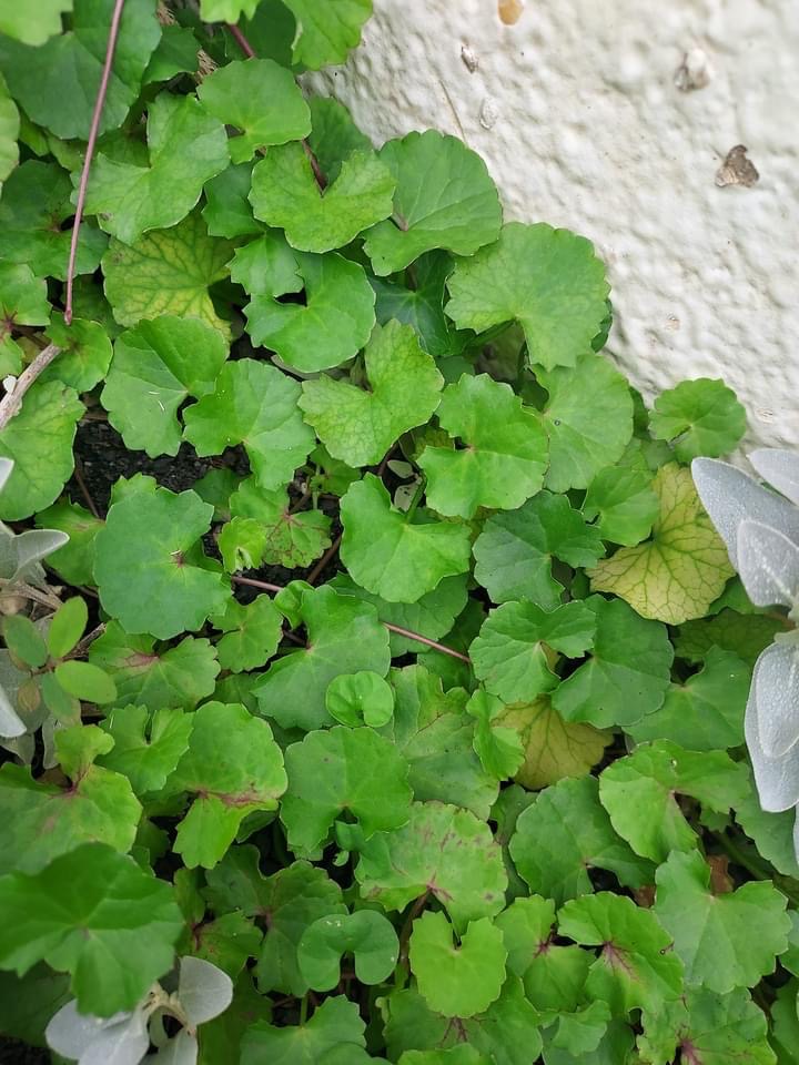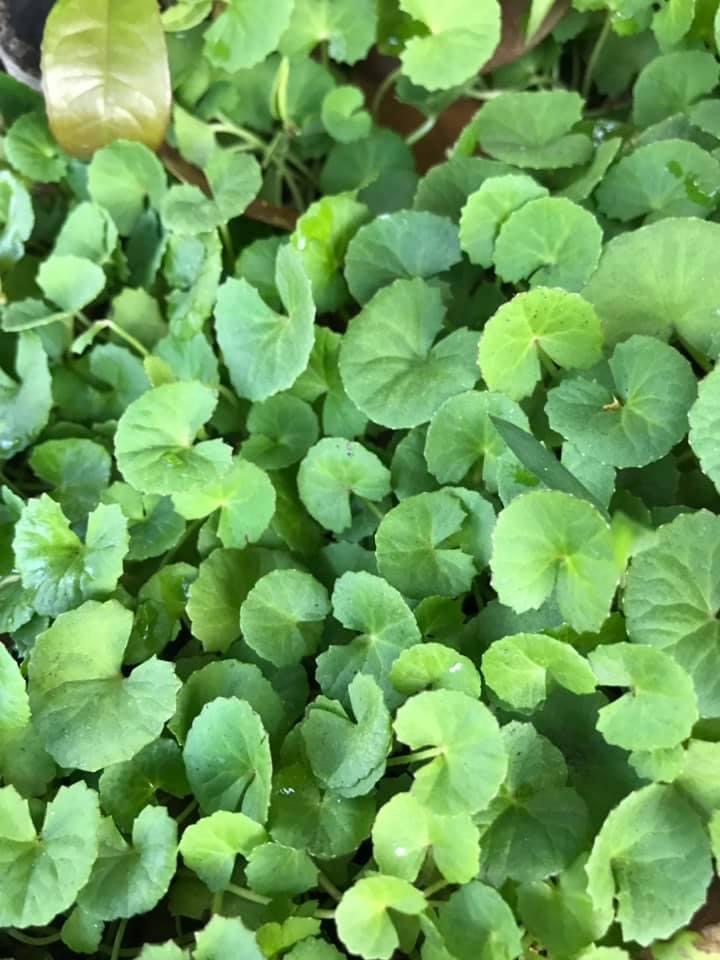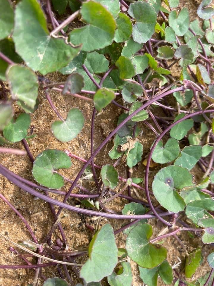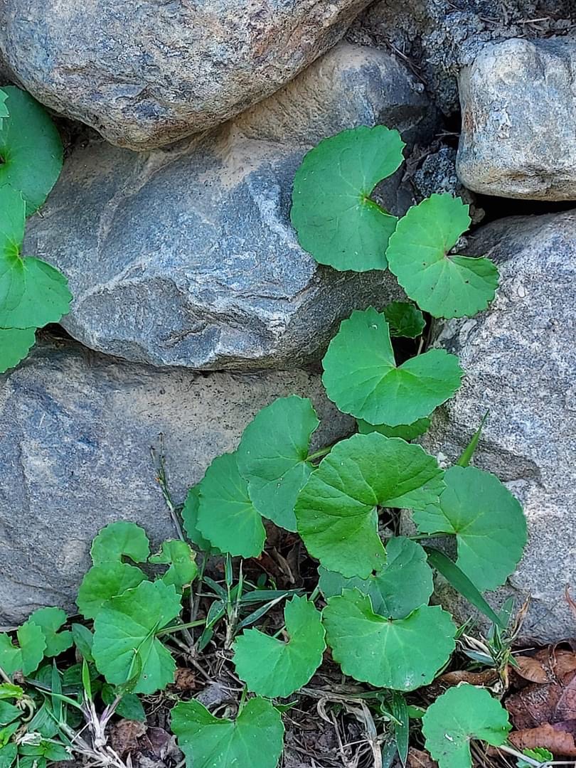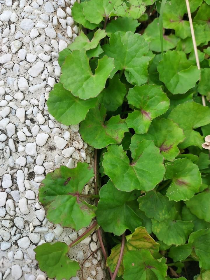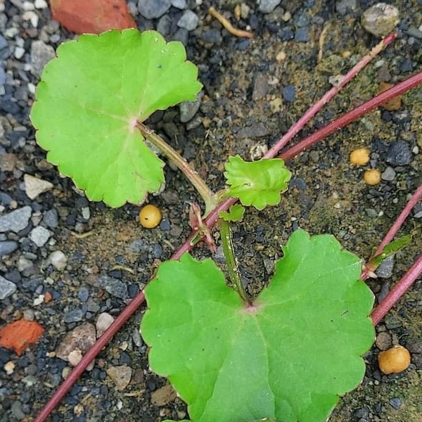 (原生種;維基百科標名積雪草,別名雷公根、崩大碗、蚶殼草;草本,莖匍匐地面,常呈紫紅色,如鐵線狀;全株被有微毛;節間長,在節上長根生葉及花序;單葉,互生,叢生於莖節,具長柄,圓腎形,鈍鋸齒緣;頭狀繖形花序,腋生;花 朵細小,花瓣5枚,紅紫色;離果,扁圓形,常3個併生)