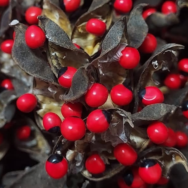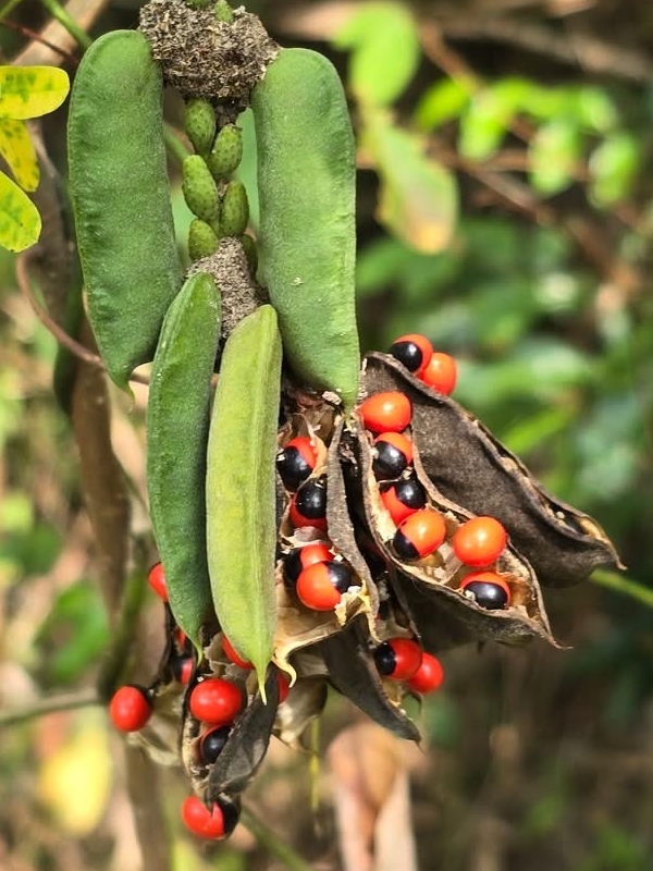 ![]() 上面照片:潘玉郎拍攝 (莢果短條狀,略扁,具喙,內含種子4~6顆;種子堅硬,一端紅色,一端黑色,紅多於黑,具光澤,形色像瓢蟲) |