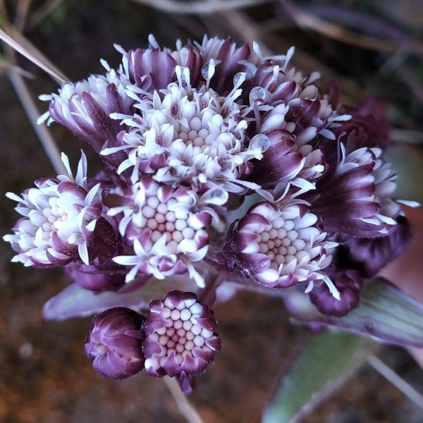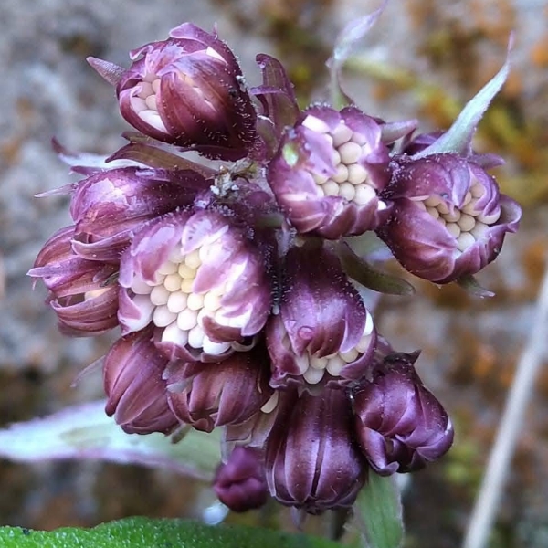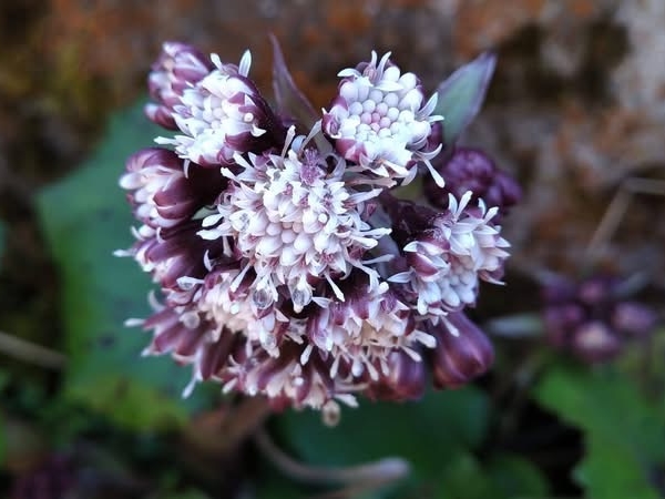 (台灣特有種;台灣物種名錄標名台灣款冬;多年生草本;雌雄異株;根莖粗大;葉分為根生葉及莖生葉;根生葉叢生狀,心形至腎形,細鋸齒緣;莖生葉長橢圓狀披針形,全緣;頭狀花序呈圓錐狀排列,雌雄異花,全為管狀花,白色;雌性植株,每個頭花僅具2~5朵心花,心花不稔,外圍花柱多且細長,可稔)