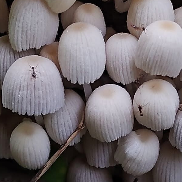 (原生種;台灣物種名錄標名簇生鬼傘,別名膜蓋鬼傘,附有照片;常見,小型,傘徑0.5~1.2公分;具褶紋;顏色隨成熟度變化(白→乳白→灰→深灰→紫黑→黑色),然後乾枯,生命短暫,大約只有一天)