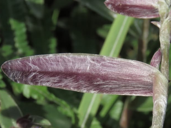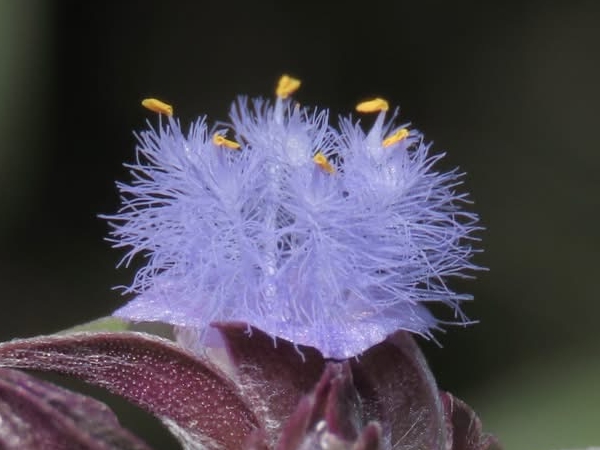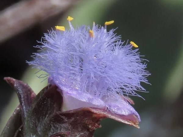 ![]() 上面照片:周佩玉拍攝 (花瓣3枚,淡紫紅色;雄蕊6枚,雌蕊柱頭單一,花絲和花柱先端膨大,密被長毛(微距攝影可見鏈珠狀毛),藍紫色) |