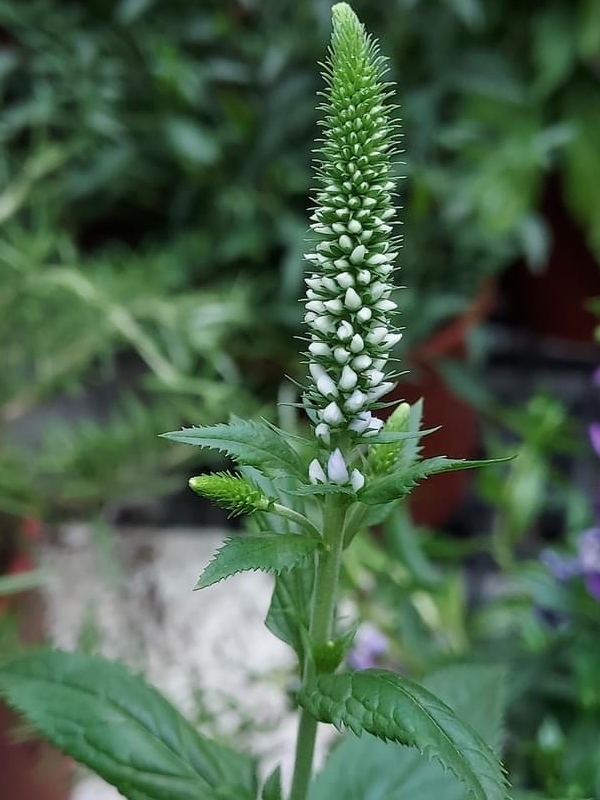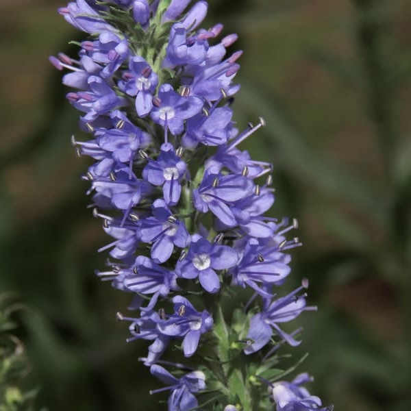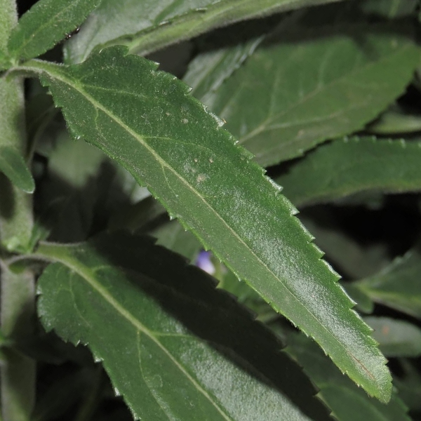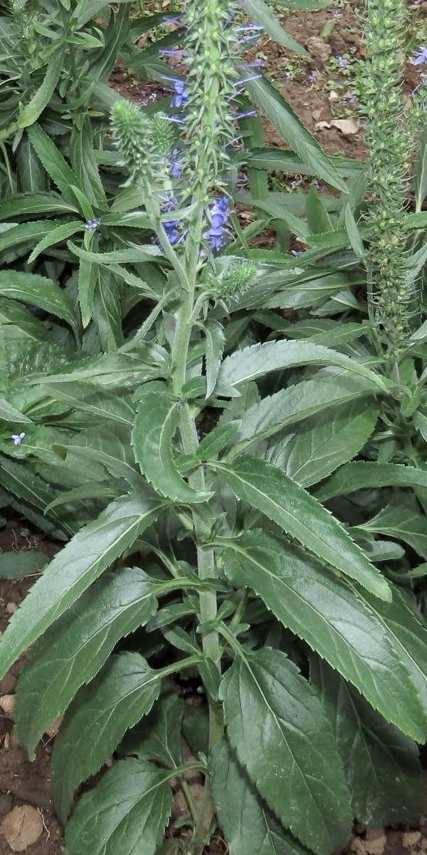 (栽培種;原生於歐洲附近一帶;草本;全株密被細毛;單葉對生,長卵形至披針形,鋸齒緣;葉柄具翼;穗狀花序,頂生;花冠藍紫色;雄蕊2枚,特長,直伸;雌蕊柱單一,直線狀;花萼4枚,披針形,具緣毛;蒴果卵形,2瓣狀,略扁,先端微凹)