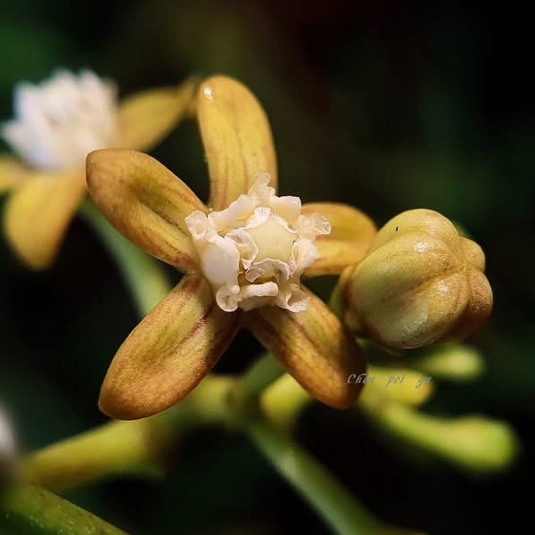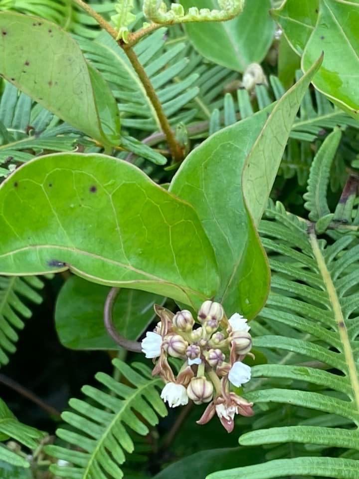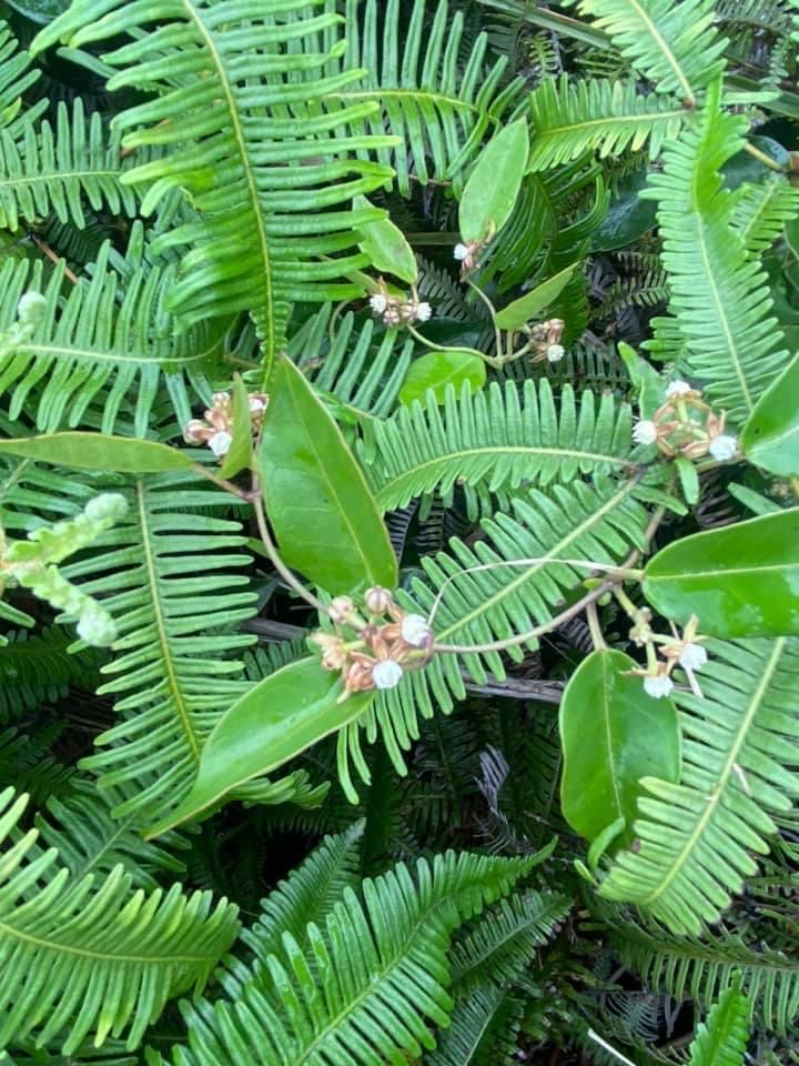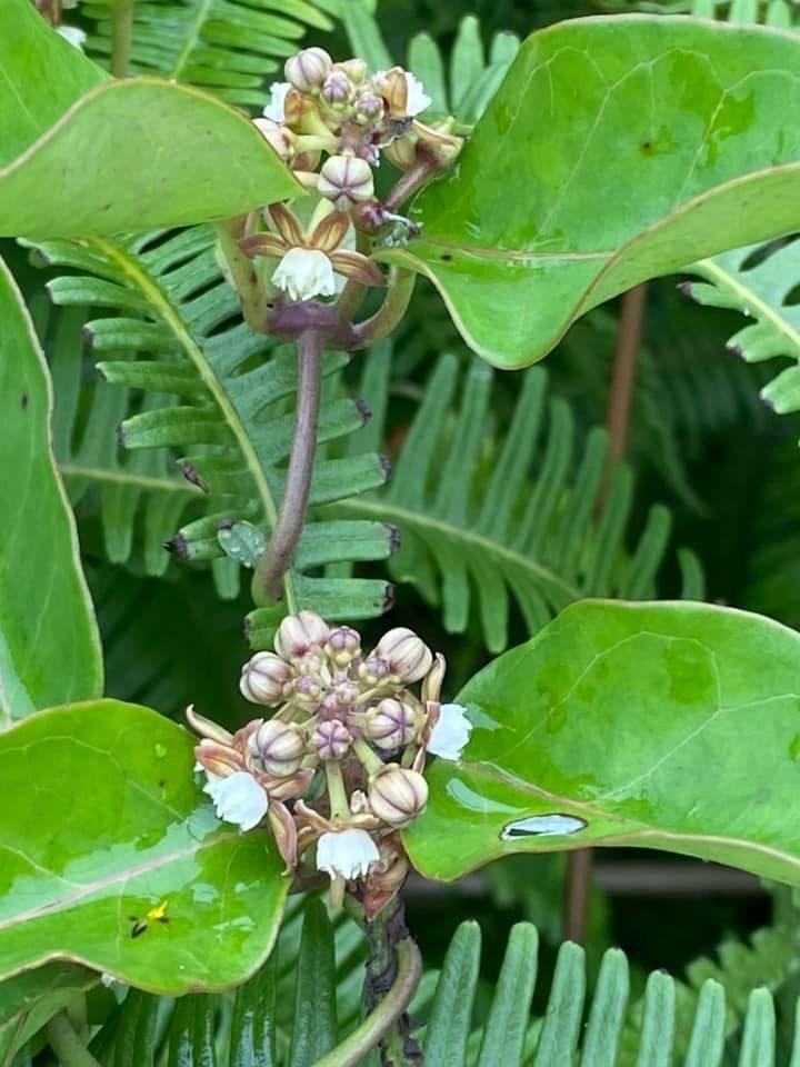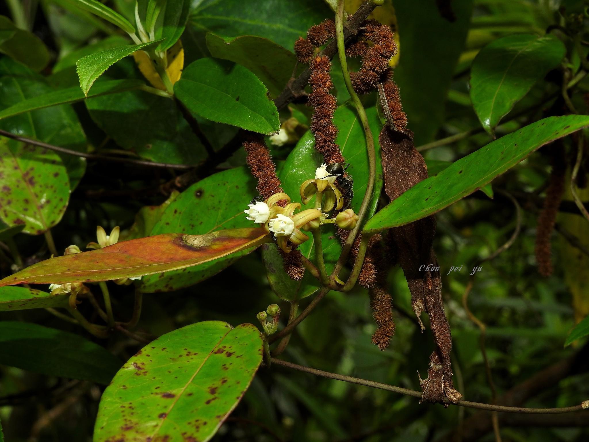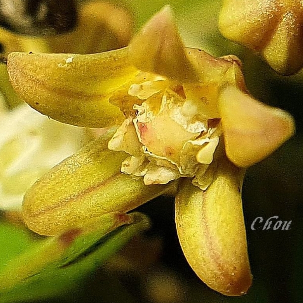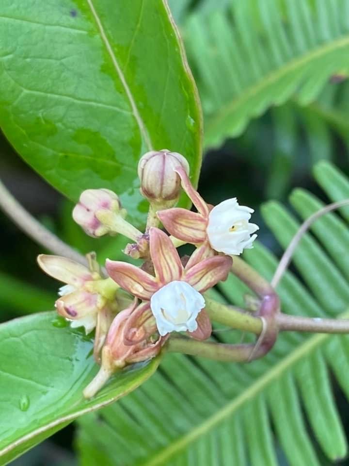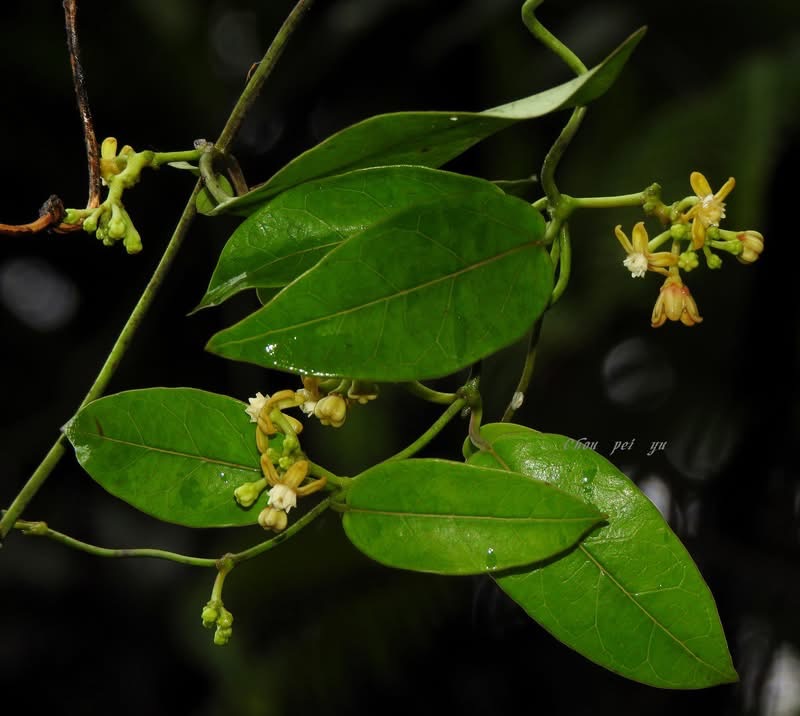 (原生種;維基百科標名台灣杯冠藤;纏繞性藤本;單葉對生,長卵形至長橢圓形;聚繖花序,腋生,花瓣5枚,副花冠杯狀;蓇葖果披針形)