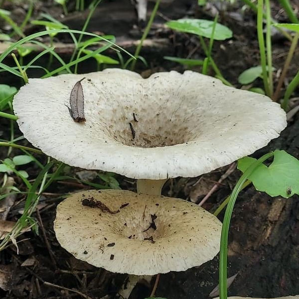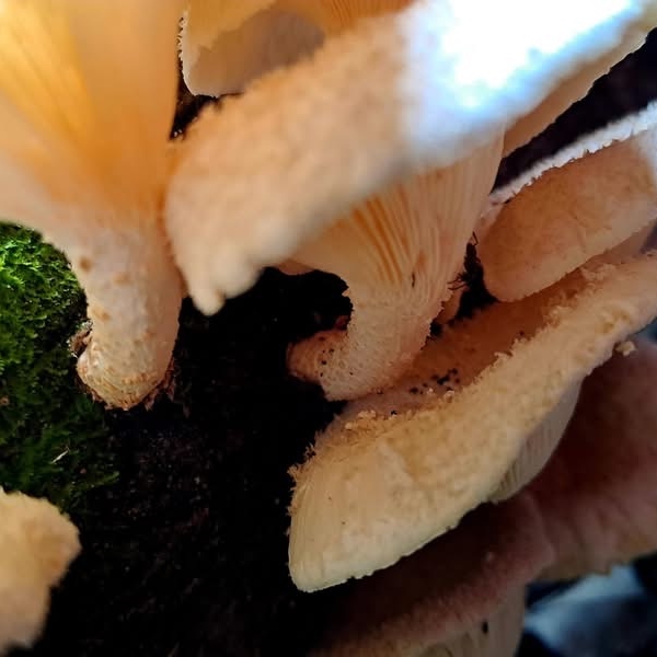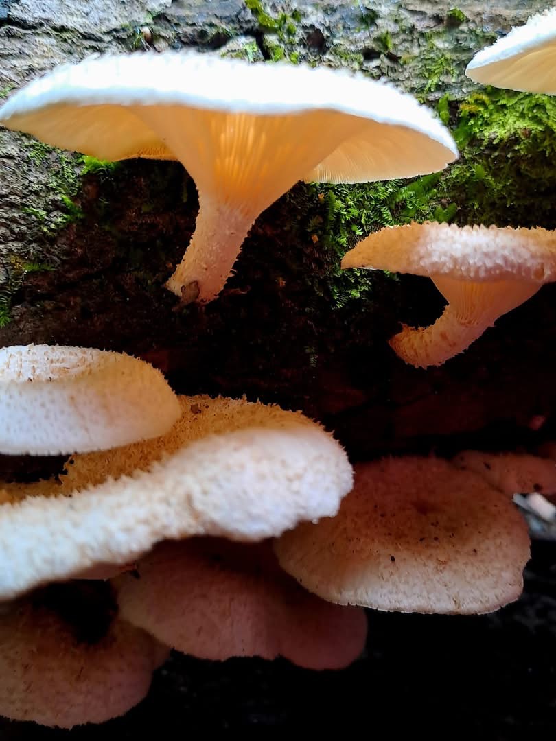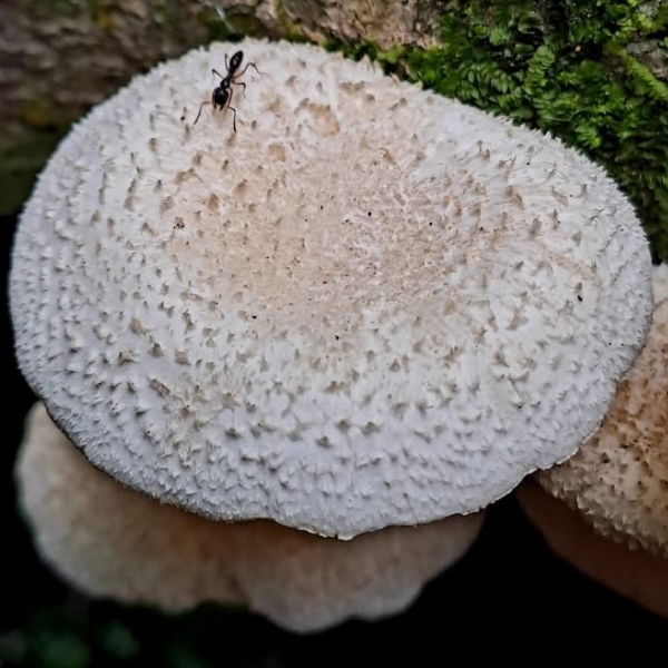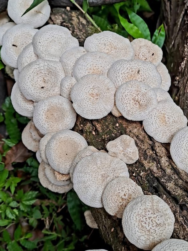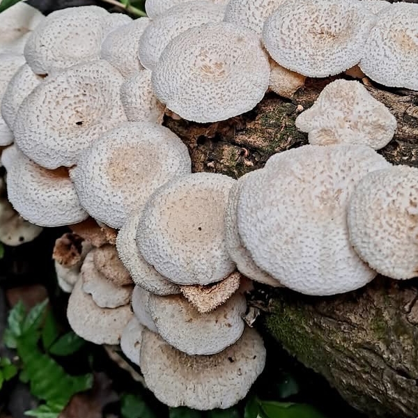 (原生種;虎皮香菇之翹鱗變種;台灣物種名錄僅有學名,尚無中文名,標示香菇屬;維基百科標名翹鱗韌傘,標示韌傘屬;主要在闊葉樹的枯枝幹群生;傘徑2~8公分,漏斗狀,表面黃白色,密佈翹鱗;柄覆具毛鱗;此物種型態像傘菌目,卻歸類於多孔菌目的多孔菌科,甚為特殊)