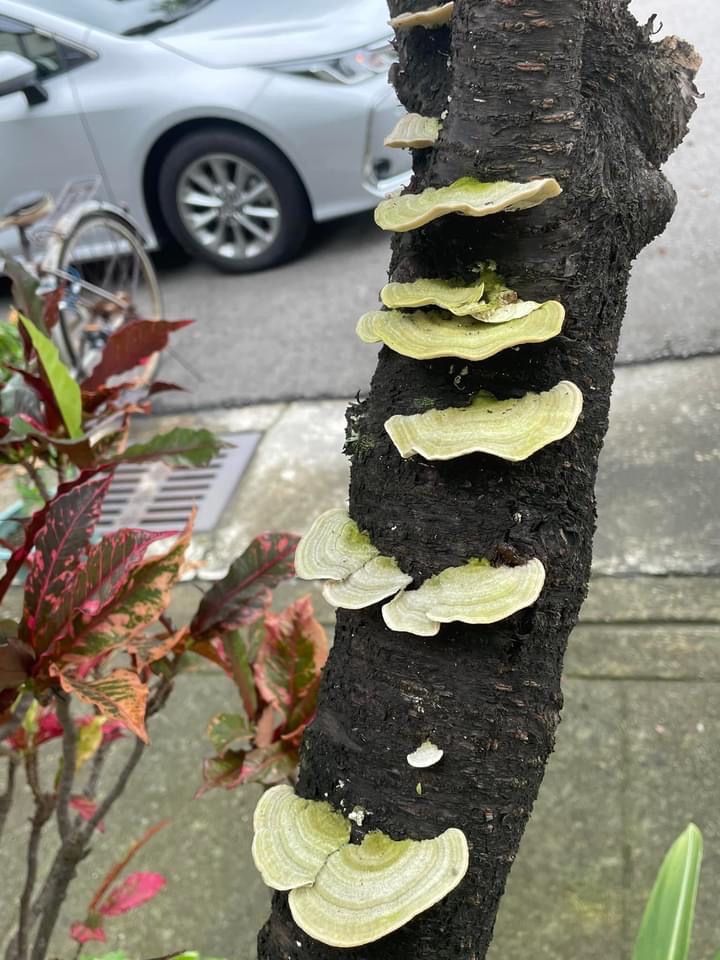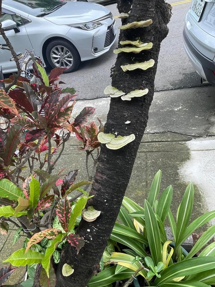 (台灣物種名錄查無此學名及中文名;維基百科標名一色齒毛菌;英文版維基百科附有照片(型態相符,顏色為淡褐色);香港柴娃娃大型真菌網標名單色革蓋菌,別名單色雲芝,附有照片(相符);附生菌蓋表面是藻類;菌褶早期呈迷宮狀,老熟後呈齒狀;外觀與雲芝相似)
