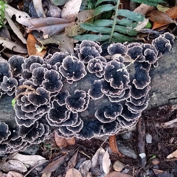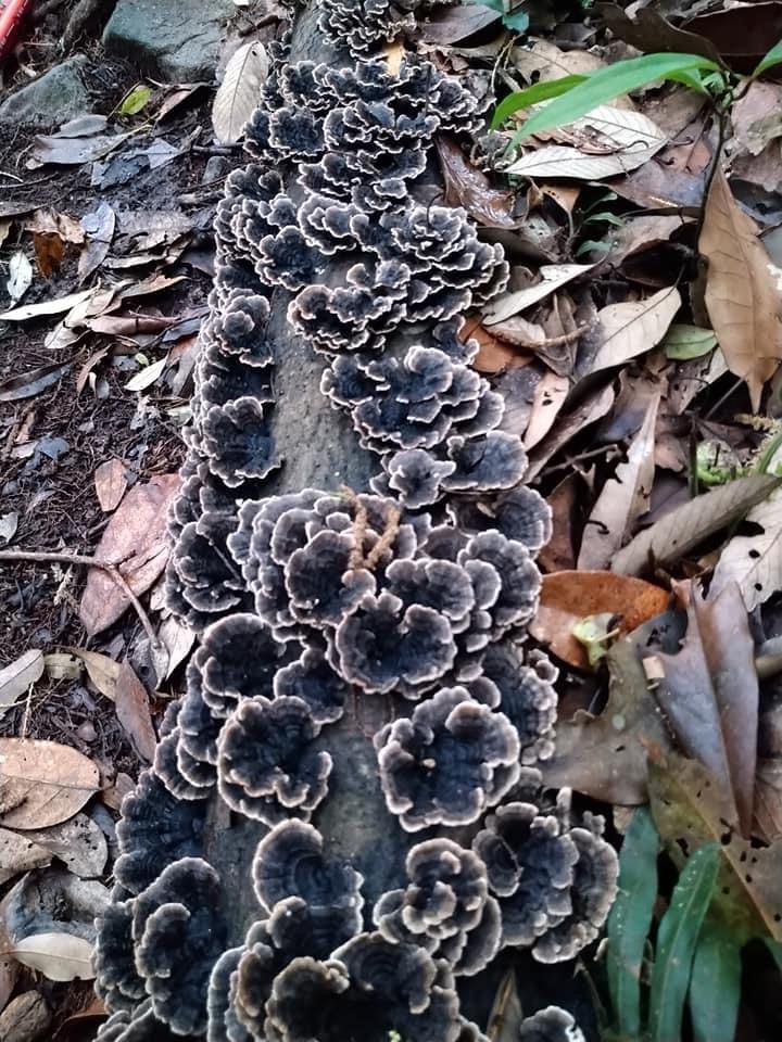 (原生種;其種加詞 versicolor意為變色的、顏色多樣的;維基百科標名雲芝,別名彩雲革蓋菌、瓦菌,附有照片;寄生枯木之真菌;菌體無柄;菌蓋半圓形至貝殼狀,表面粗糙,邊緣波浪狀,呈覆瓦狀或蓮座狀)