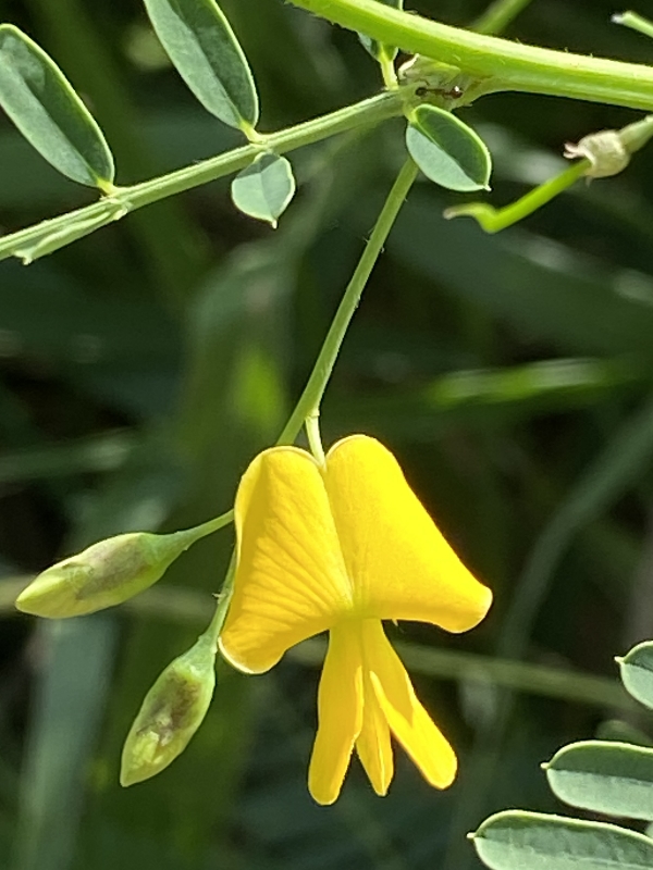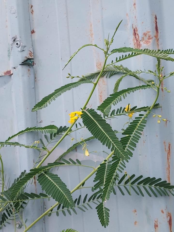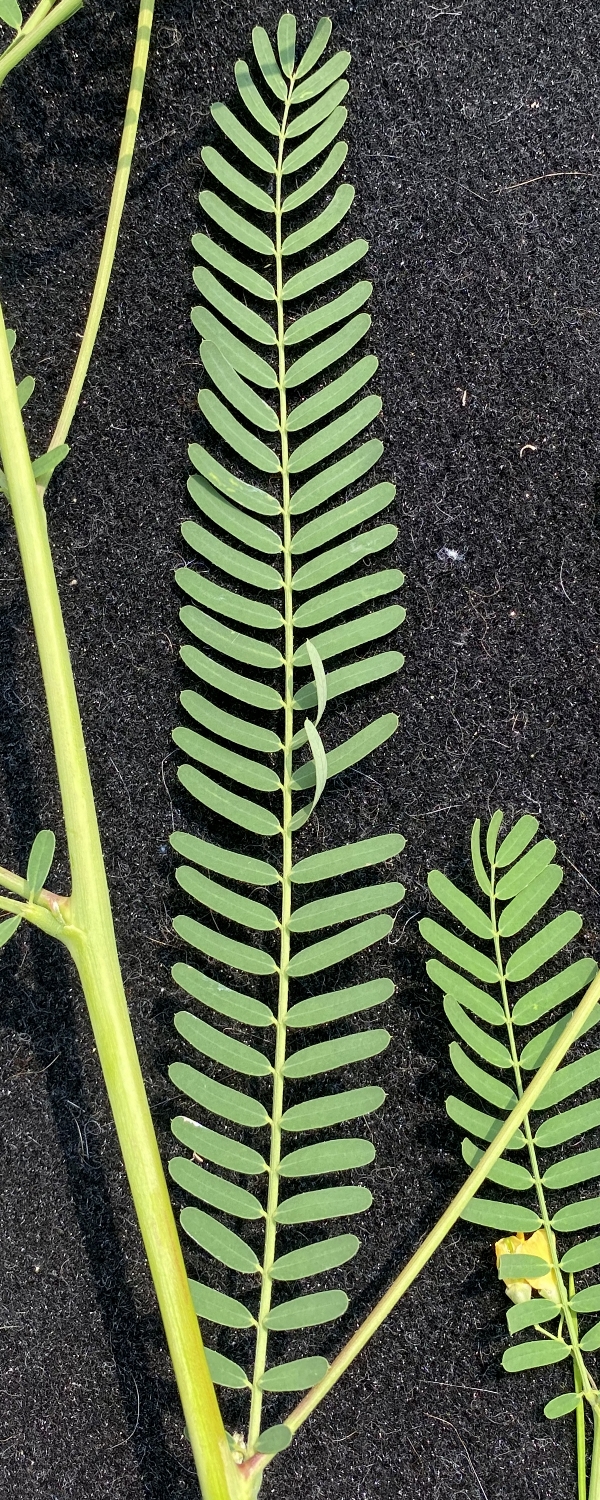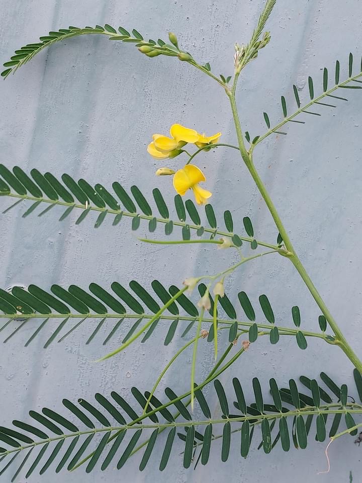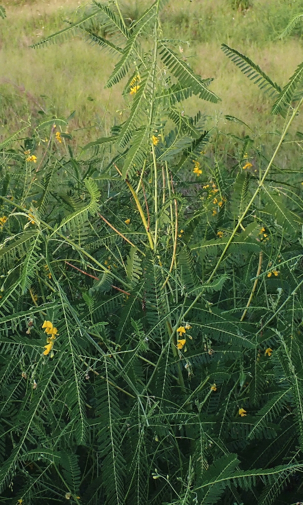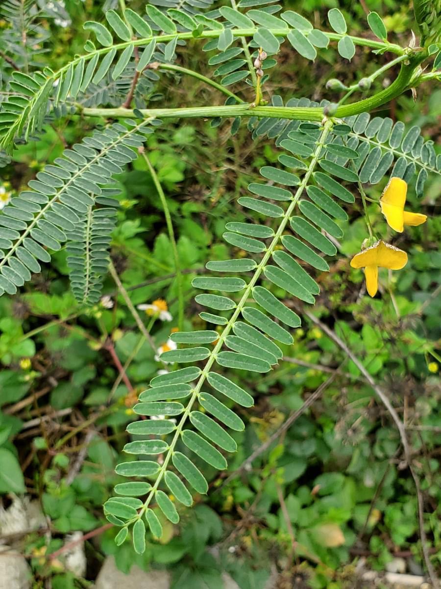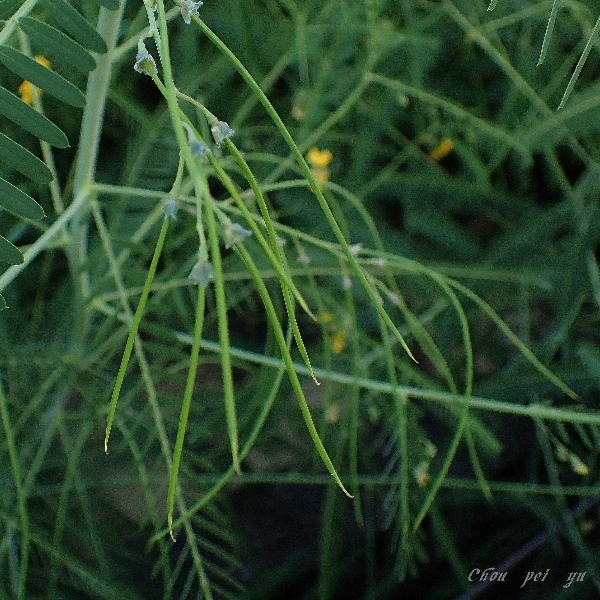 (歸化種;一年生草本;株高可達2公尺以上;偶數羽狀複葉,互生;小葉20~40對,長橢圓形,先端有小銳尖,葉軸兩端的小葉較小;總狀花序,腋生,3~9朵,花冠黃色;莢果線形,長約20公分)
