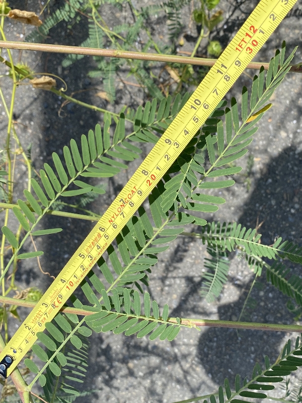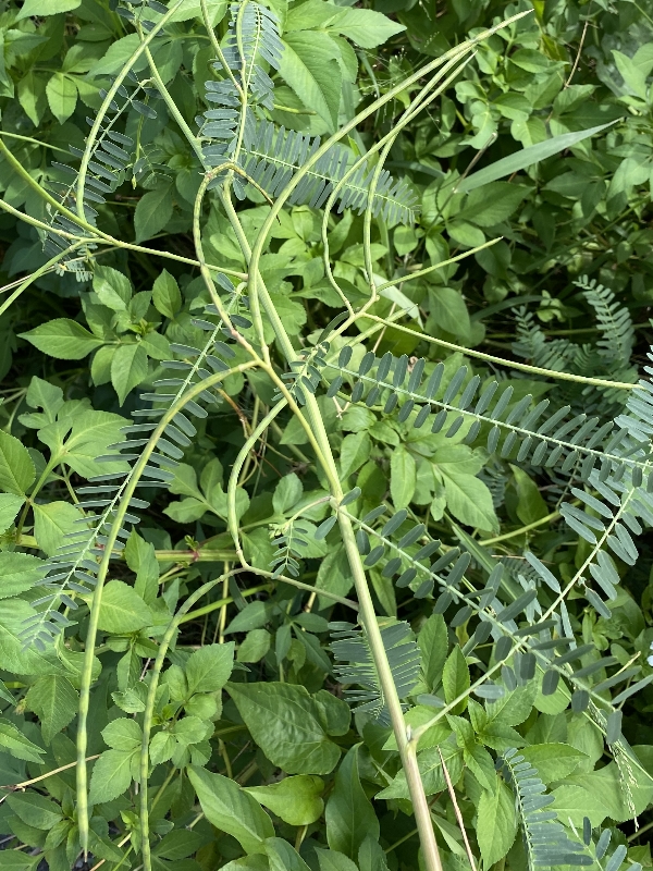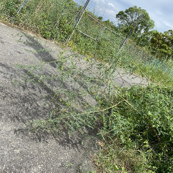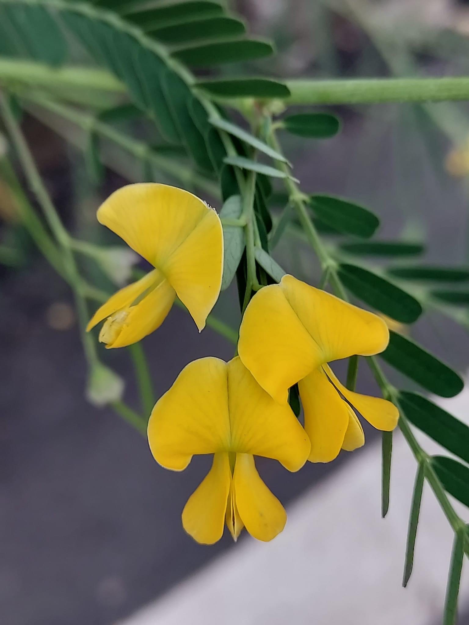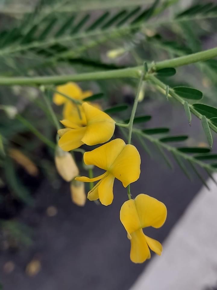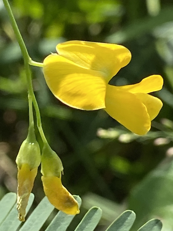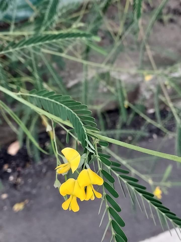 (歸化種;一年生草本;株高可達2公尺以上;偶數羽狀複葉,互生;小葉20~40對,長橢圓形,先端有小銳尖,葉軸兩端的小葉較小;總狀花序,腋生,3~9朵,花冠黃色;莢果線形,長約20公分)