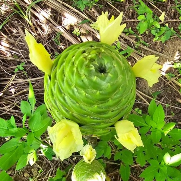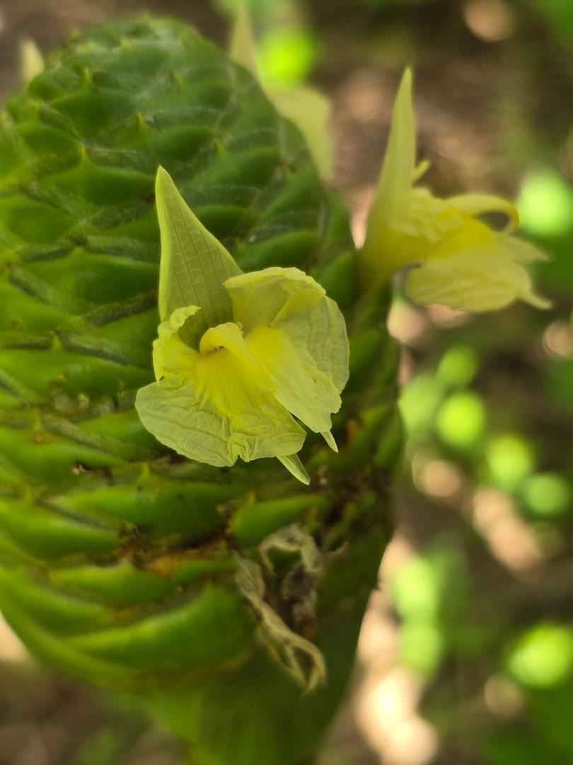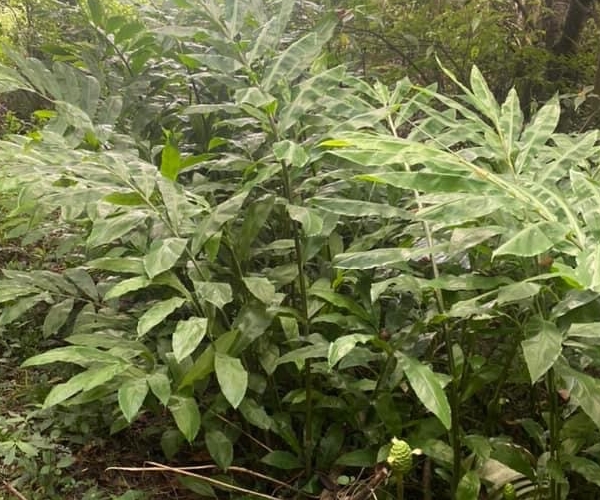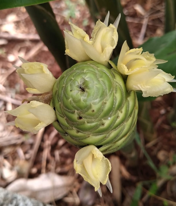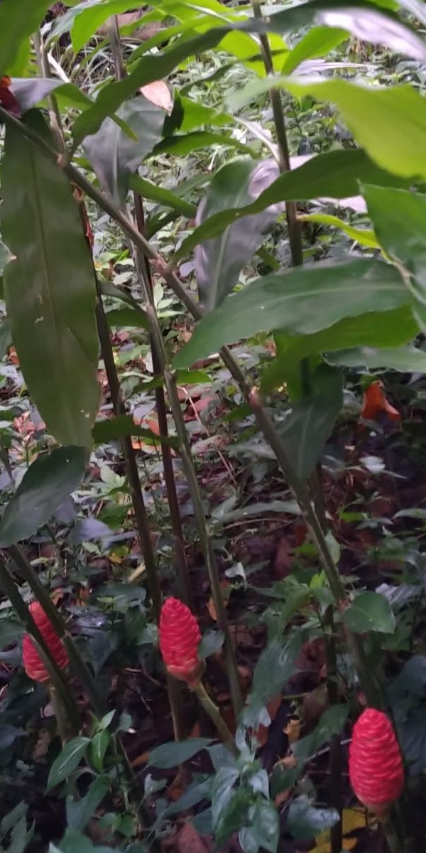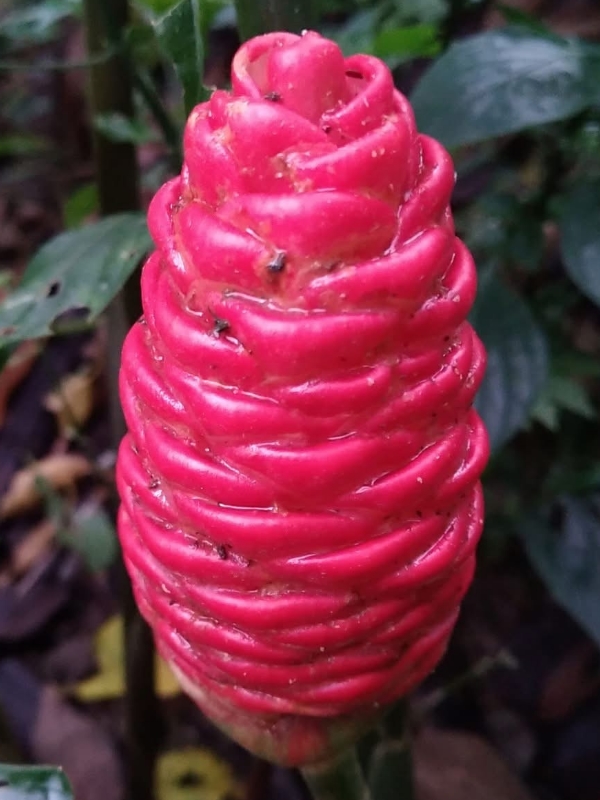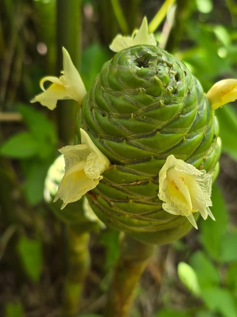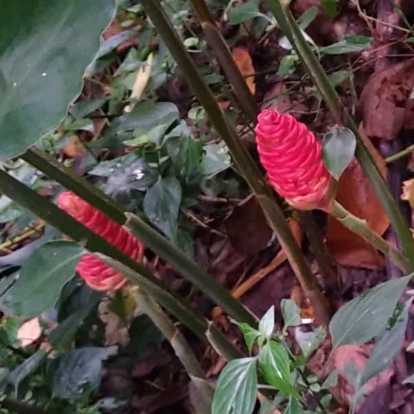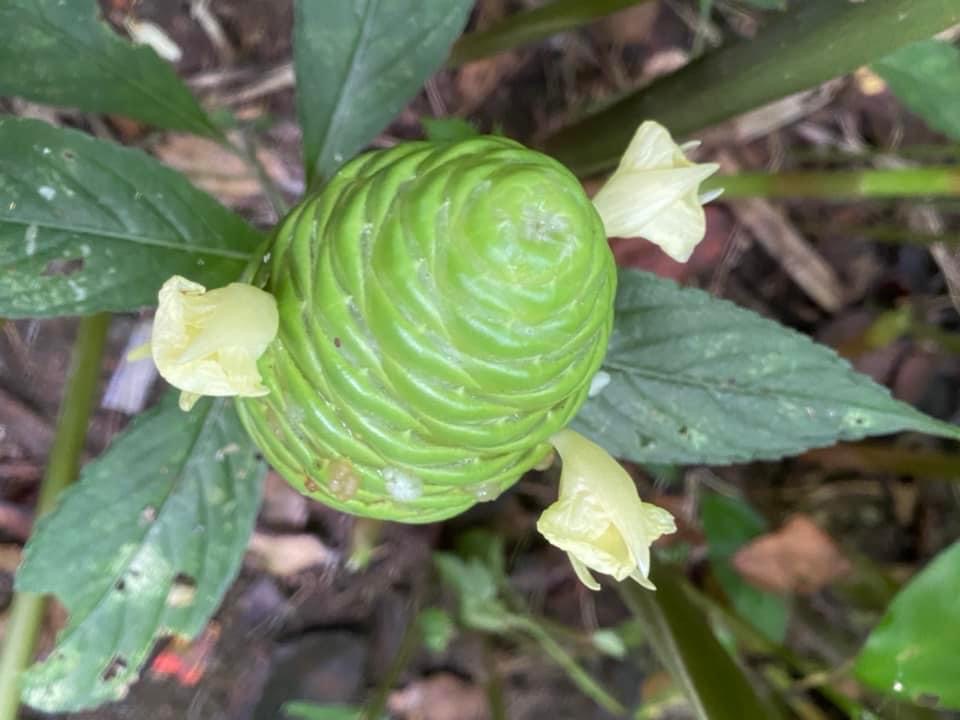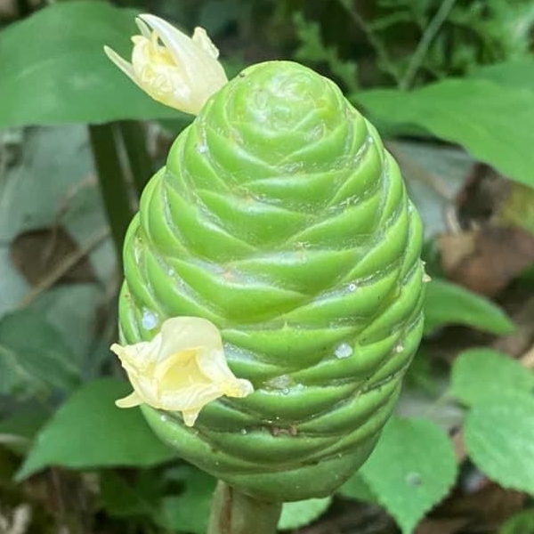 (歸化種;台灣物種名錄標名薑花(容易與薑 Zingiber officinale 混淆),附有照片;維基百科標名紅球薑,附有照片;多年生草本;株高可達2公尺;花序毬果狀,頂生於自地下抽出的花莖,苞片呈覆瓦狀,排列緊密,初為綠色,後轉紅色;花冠淡黃色)