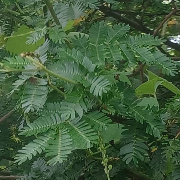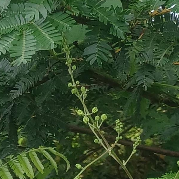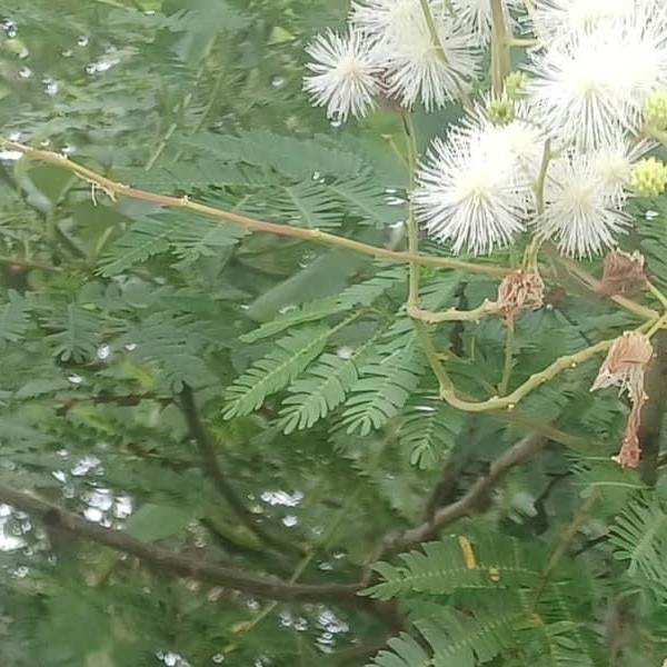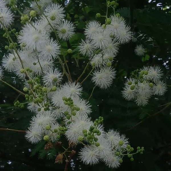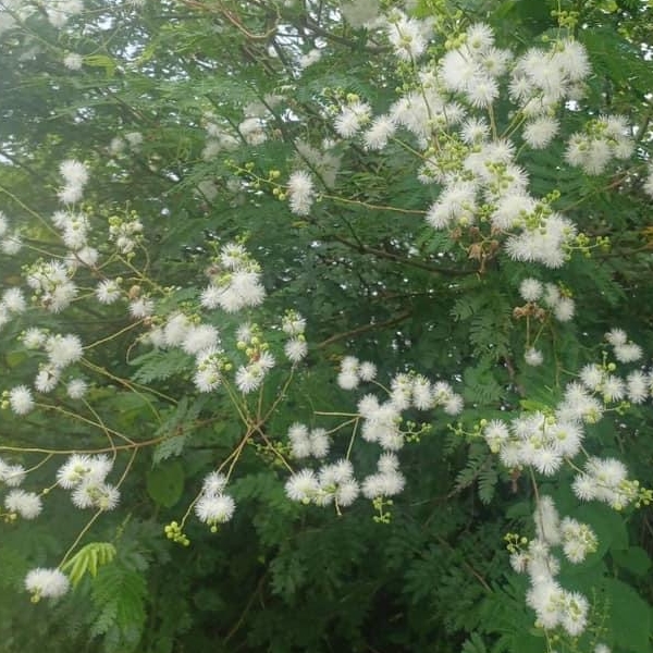 (栽培種;台灣物種名錄查無此學名及中文名;灌木,株高3~6公尺;莖和枝條疏生倒鉤刺,密被黃色短柔毛;二回羽狀複葉;小羽片2~10對;小葉21~30對;頭狀花序球形,排成總狀花序和頂生的圓錐花序;花冠白色,雄蕊多數;莢果扁平,帶狀,長近5公分)