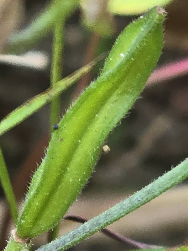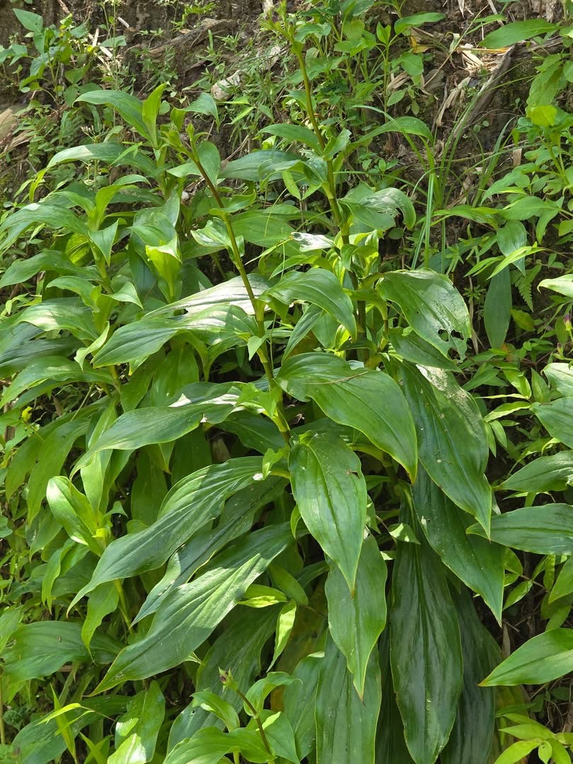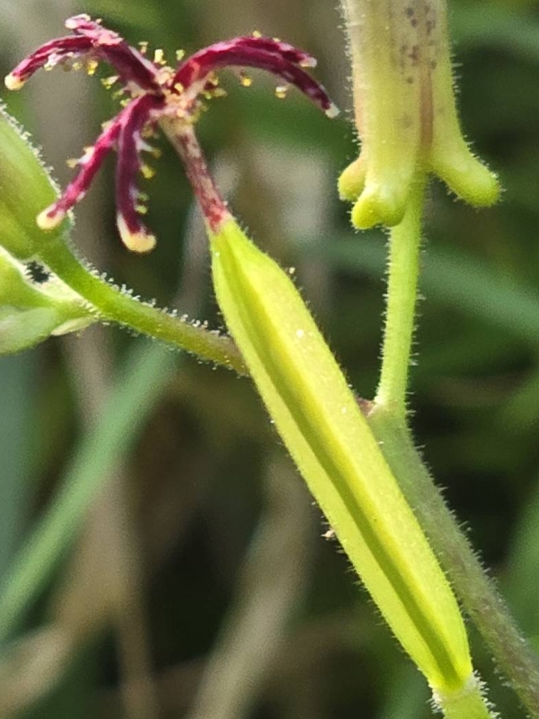 (台灣特有種;多年生草本;全株密被毛;單葉互生,卵狀披針形,兩面被毛,邊緣有毛,葉基下延成柄;聚繖花序頂生,花梗被毛;花被片6枚(內層3枚較窄,外層3枚較寬),瓣端通常帶有藍紫色;花距3枚,向外平伸,前端短分叉;雄蕊6枚,雌蕊花柱3叉,再分叉,花柱具乳突狀物;蒴果三角柱狀,被毛)