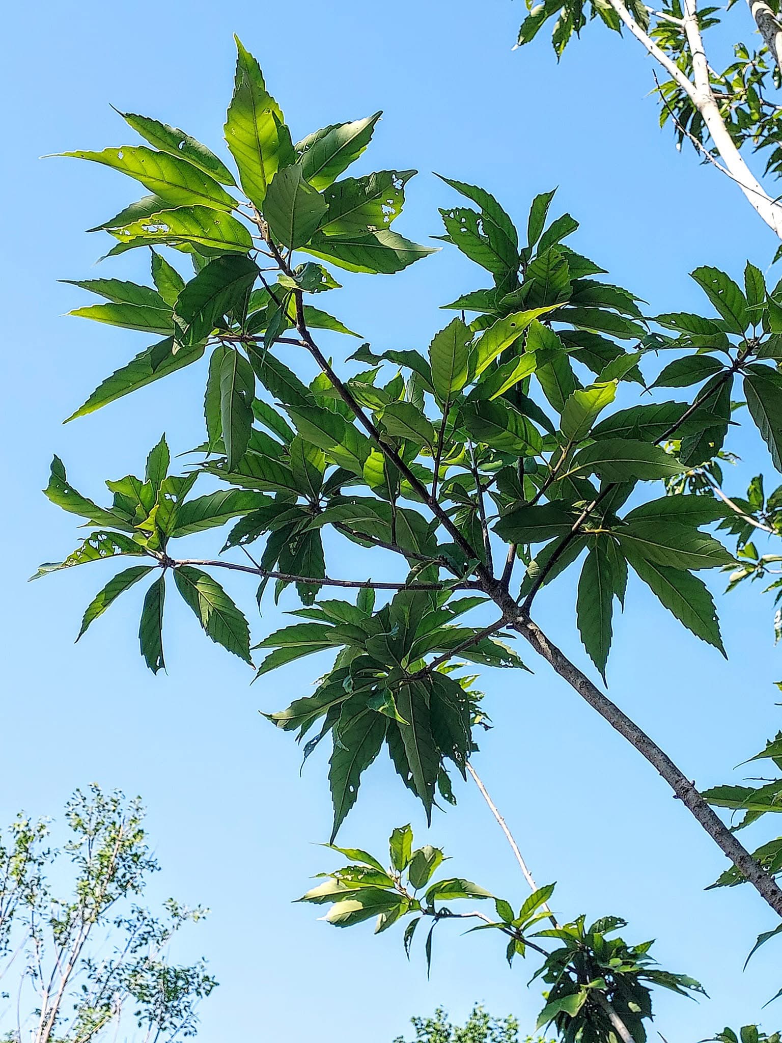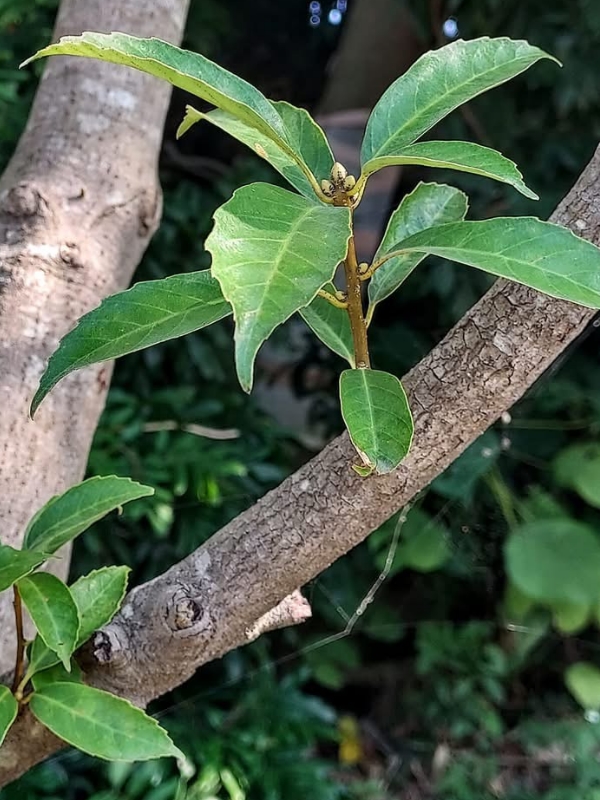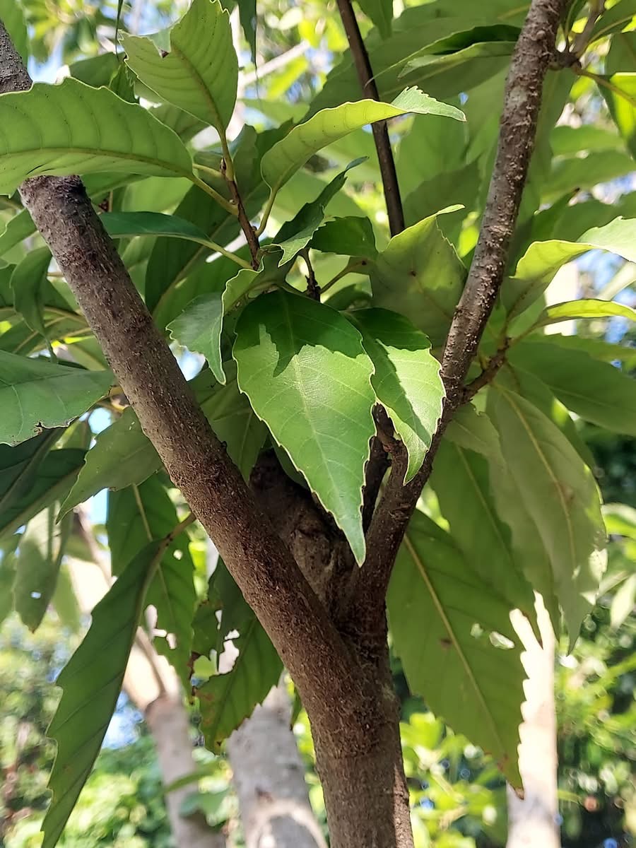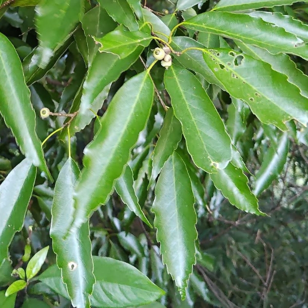 ![]() 上面照片:鄭演義拍攝 (單葉互生,長橢圓形至狹長橢圓形,鋸齒緣,葉背灰白色,葉柄長1~3公分) |
