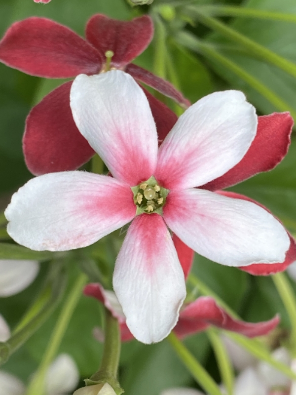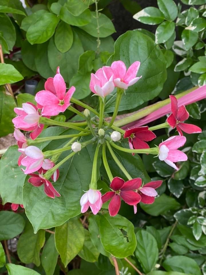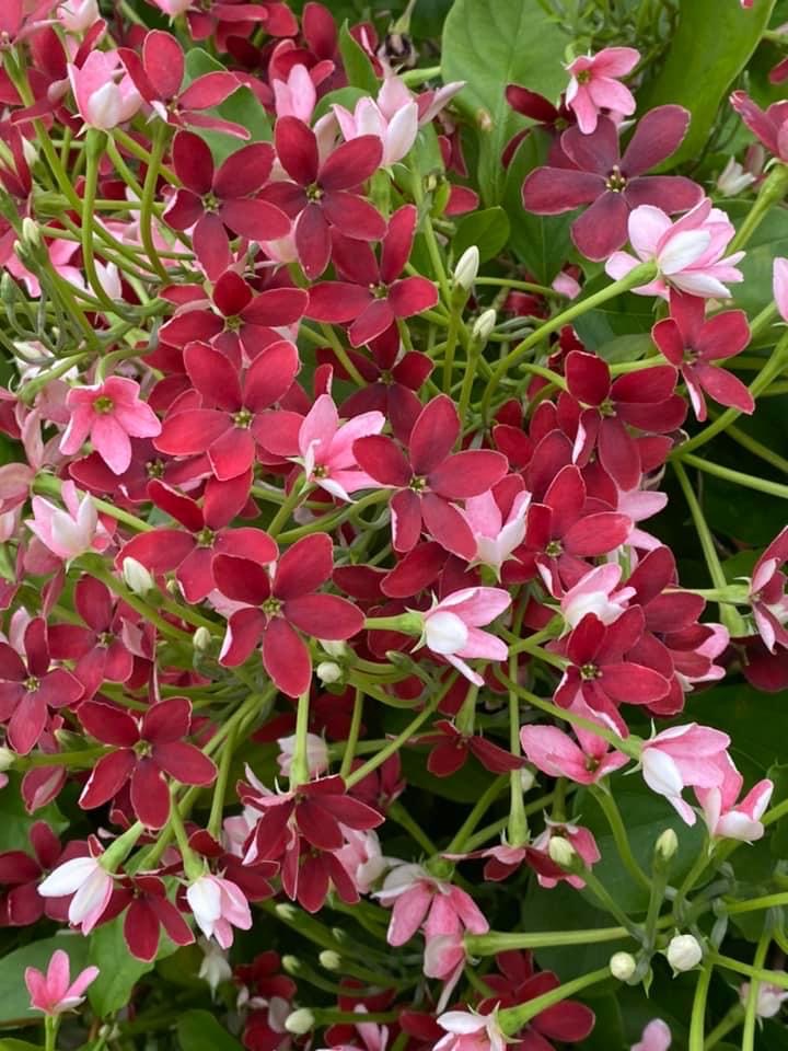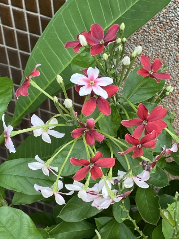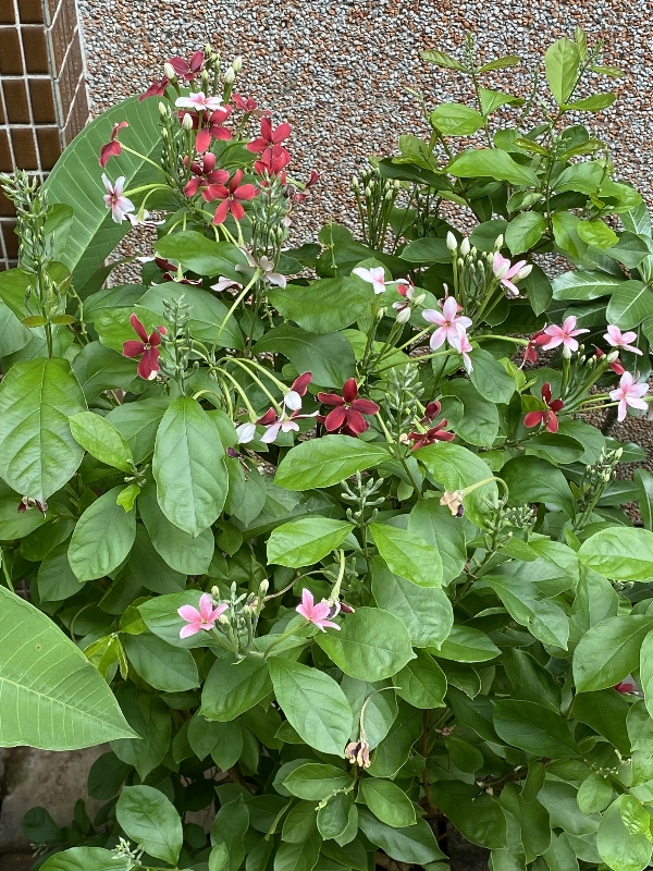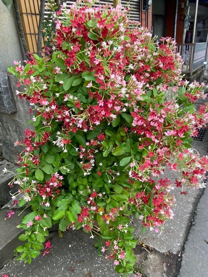 (栽培種;世界植物在線 POWO 標示 Quisqualis conferta = Combretum densiflorum,皆為有效學名,附有照片;中國植物智標名小花使君子,附有照片)
