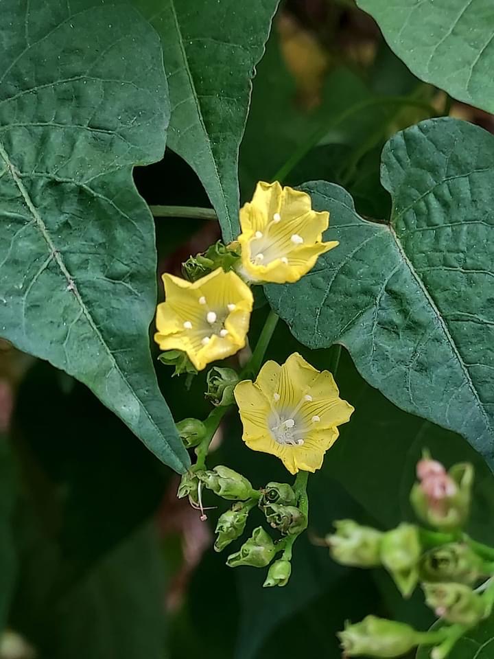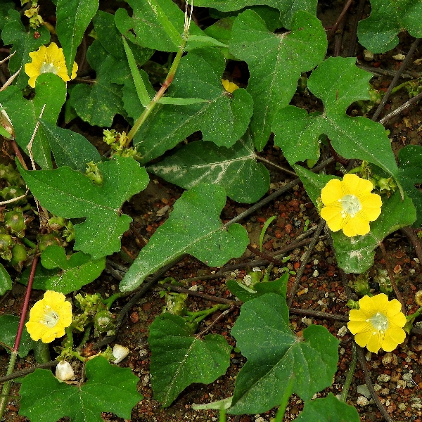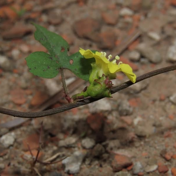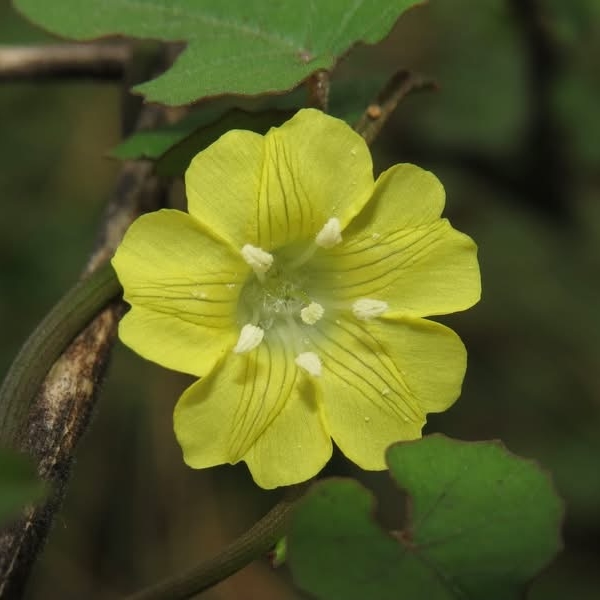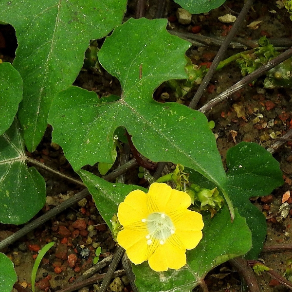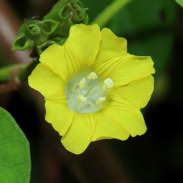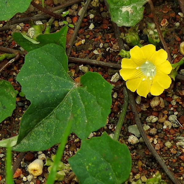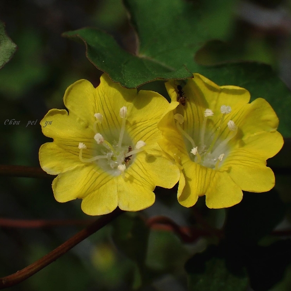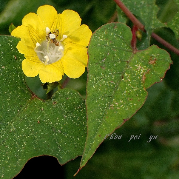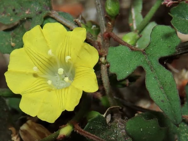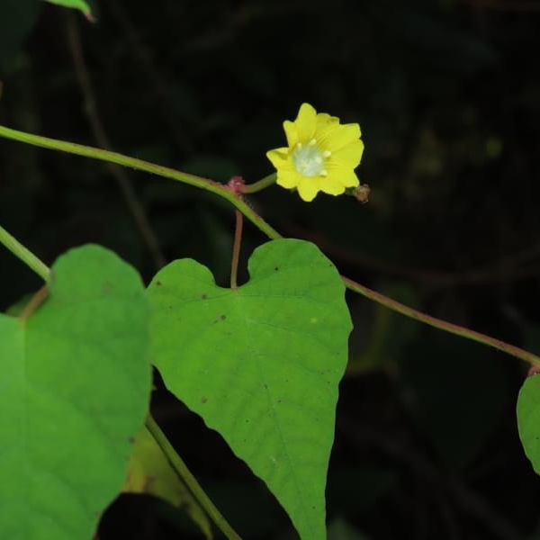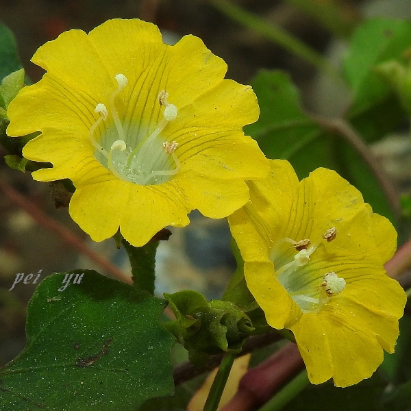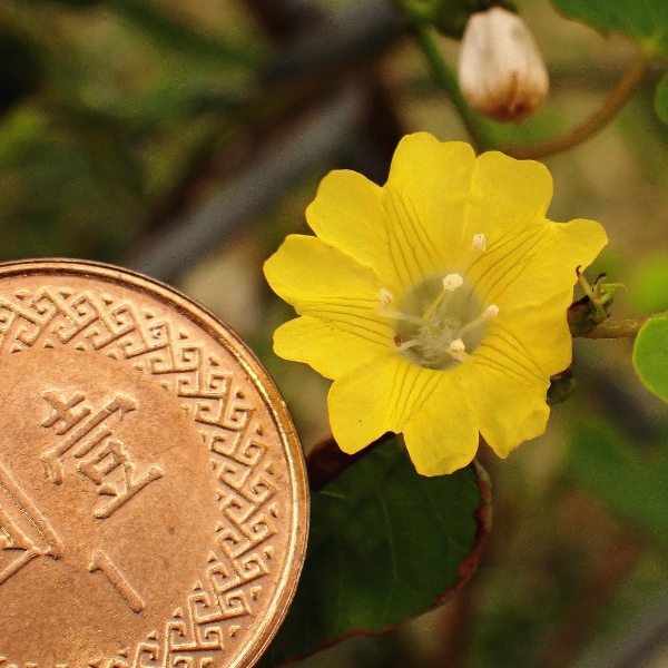 (原生種;原生於中國大陸、非洲和澳洲的三角區域;世界植物在線 POWO 附有照片(相符);台灣物種名錄標名卵葉菜欒藤 (與實際不符),別名卵葉姬旋花;維基百科標名籬欄網,魚黃草屬;香港柴娃娃植物網標名魚黃草;纏繞性藤本;單葉互生,卵心形至三裂狀掌形,長2~4公分;單花或聚繖花序,腋生;花冠黃色,花徑約1公分;雄蕊5枚,雌蕊柱頭2叉;蒴果卵球形,花萼宿存)