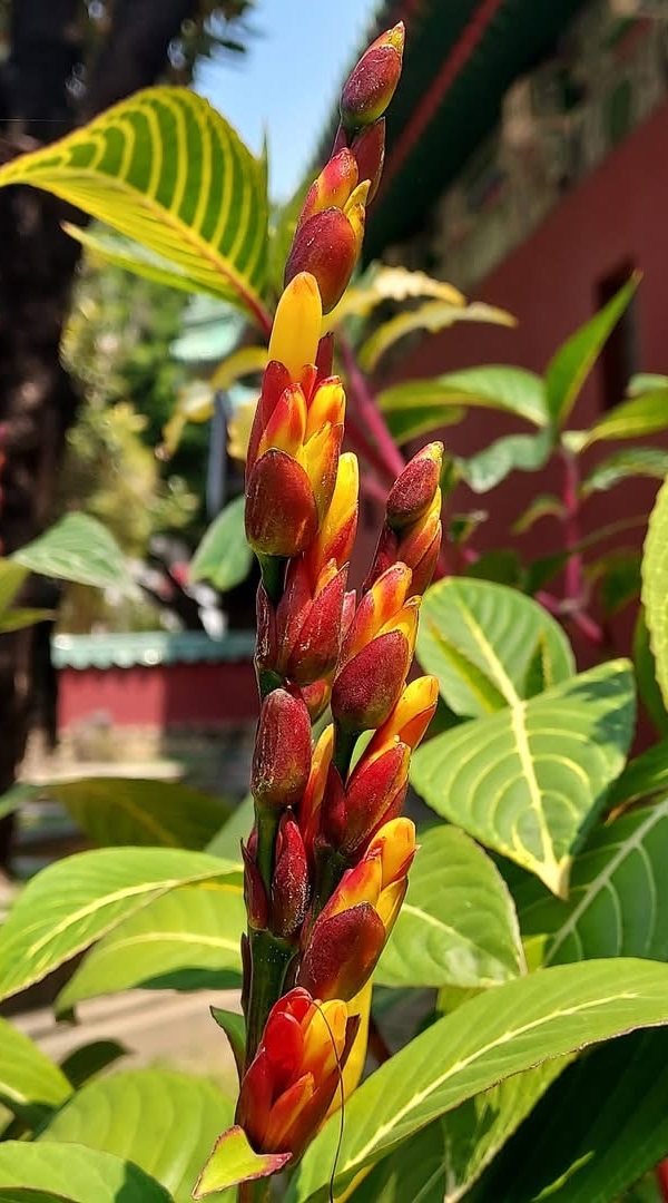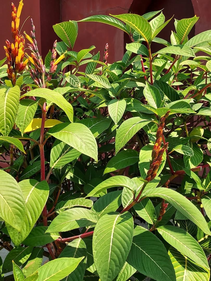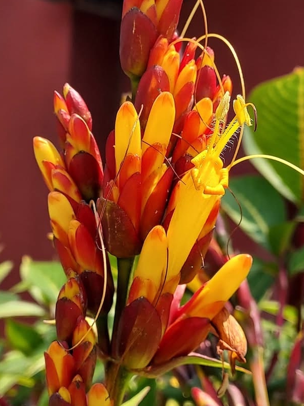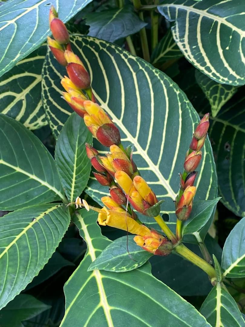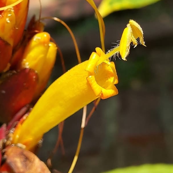 (栽培種;原生於南美洲厄瓜多;灌木;株高1~2公尺(或更高);單葉對生,橢圓形,圓齒緣,側脈每邊7~12條,葉脈呈白色至黃色;穗狀花序,頂生,具桃紅色苞片;花冠長筒狀,黃色,長約5公分,頂端5瓣裂;雄蕊2枚,伸出筒外;雌蕊單一,細絲狀,長度約為花筒2倍長)