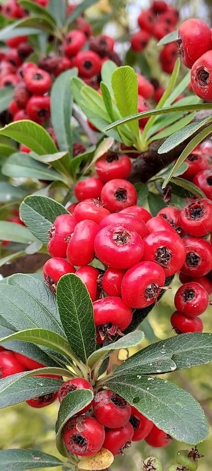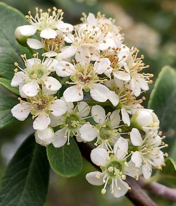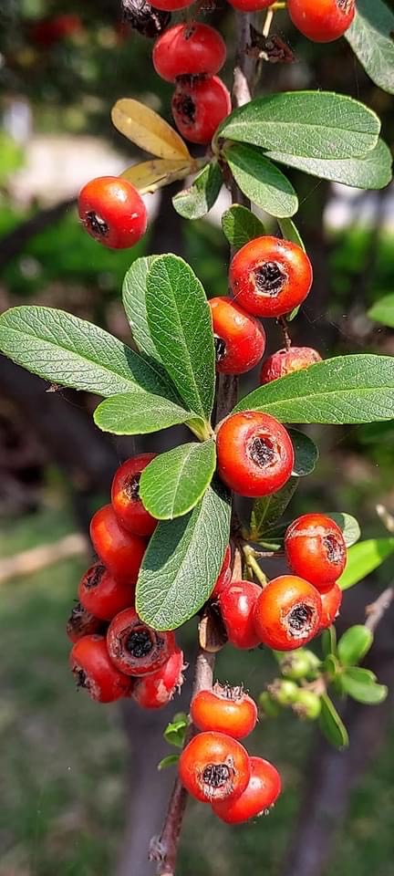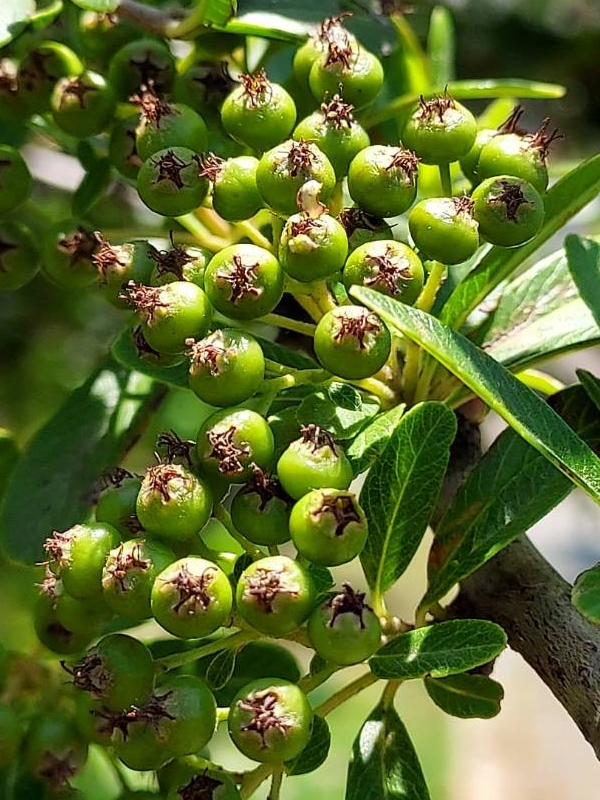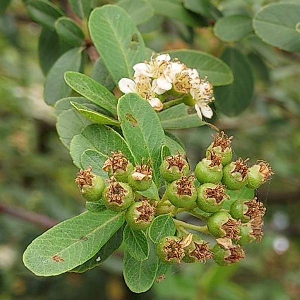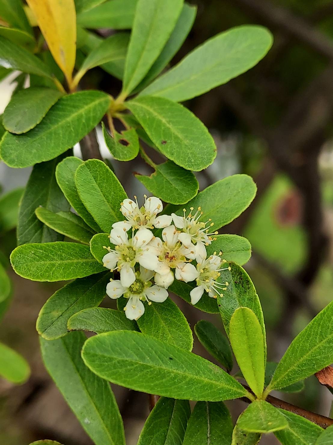 (台灣特有種;已歸化於北美和澳洲;台灣物種名錄標名台灣火刺木,附有照片;維基百科標名台灣火刺木,別名台東火刺木、狀元紅;常綠灌木;小枝的尖端呈刺狀;果實成熟如火烈般,故名火刺木;單葉互生,倒卵形至倒長卵形,先端微凹,近乎全緣;繖房花序,腋生或頂生;花瓣5枚,白色;梨果,扁球形,成熟紅色)