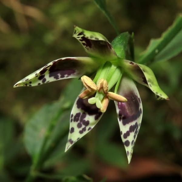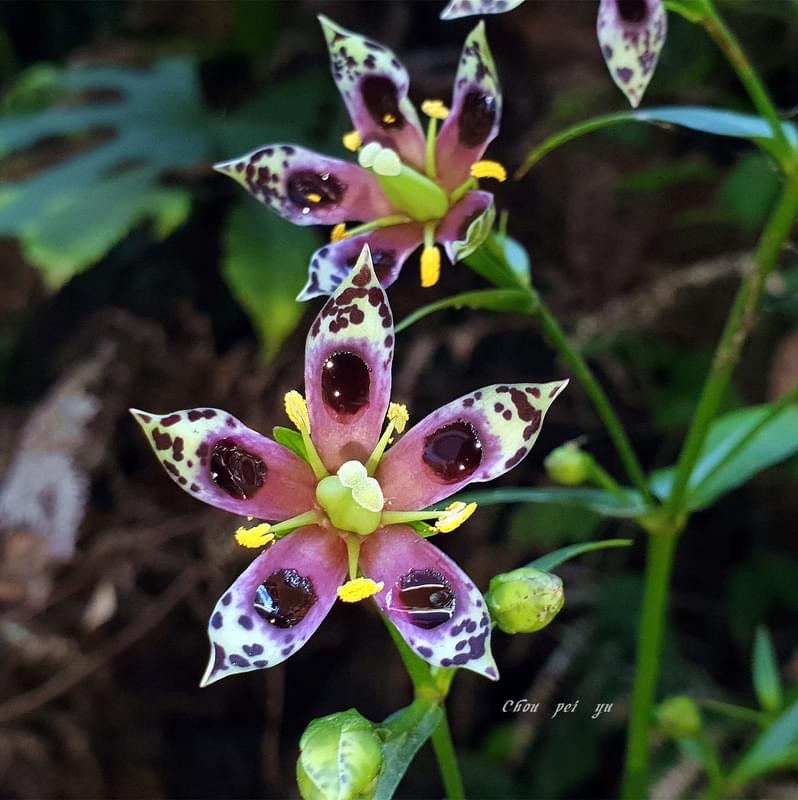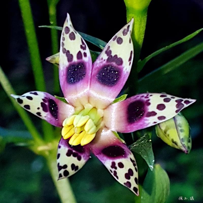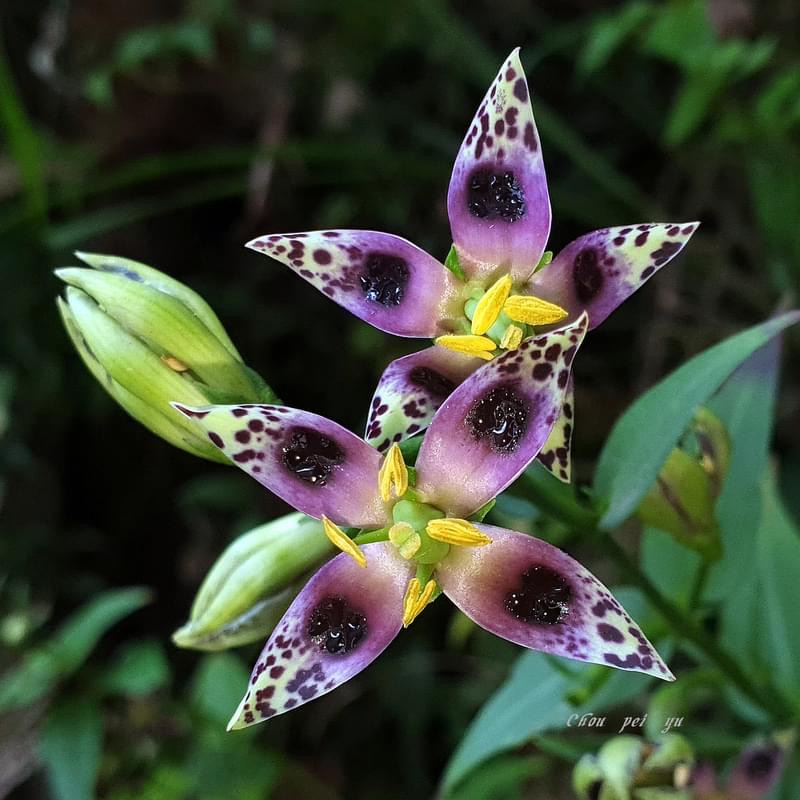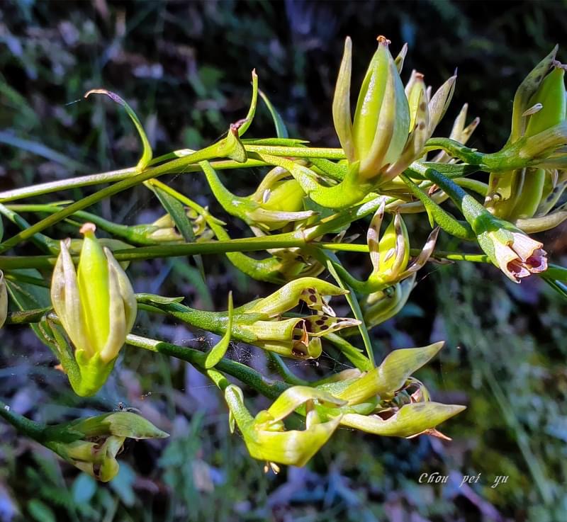 ![]() 上面照片:廖金枝拍攝 (花瓣5枚,淡黃綠色,散布紫斑,中間有一枚蜜腺(深紫色),可吸引昆蟲前來覓食;雄蕊5枚,雌蕊柱頭2叉) |