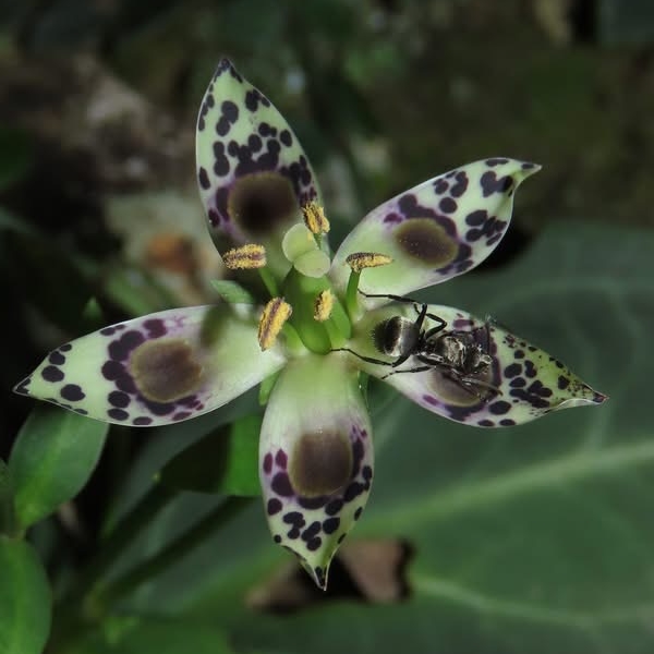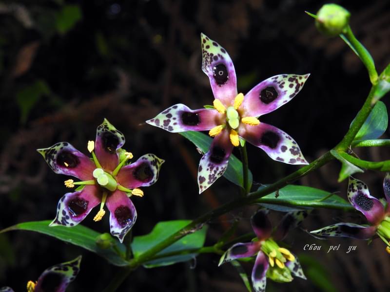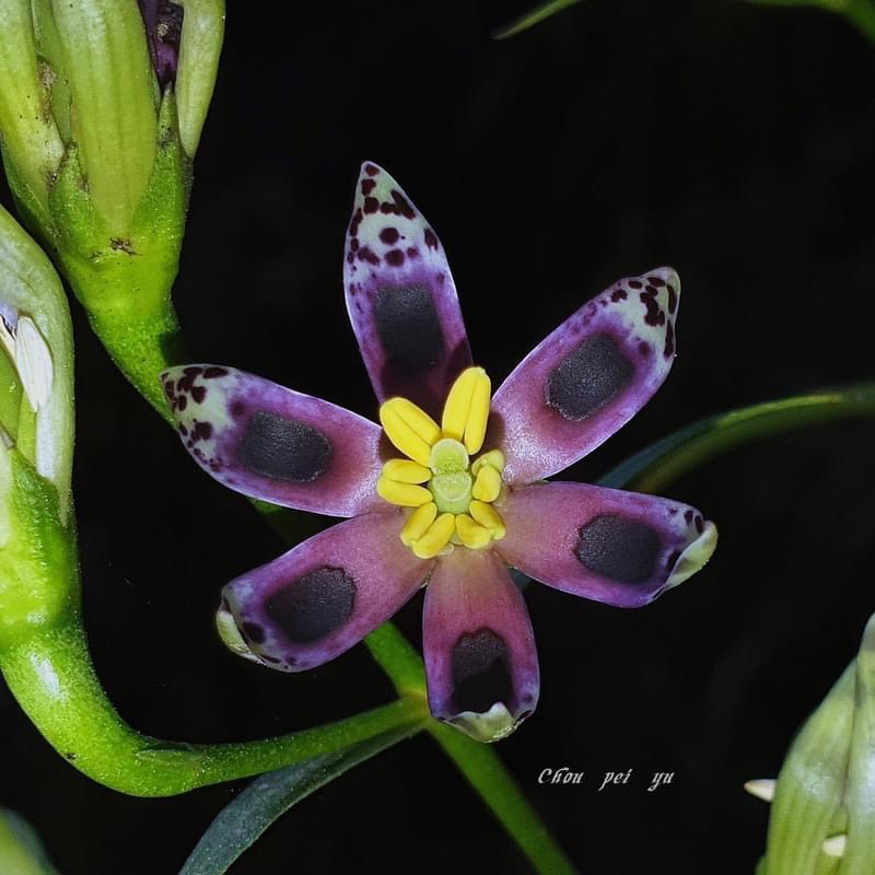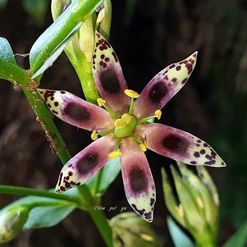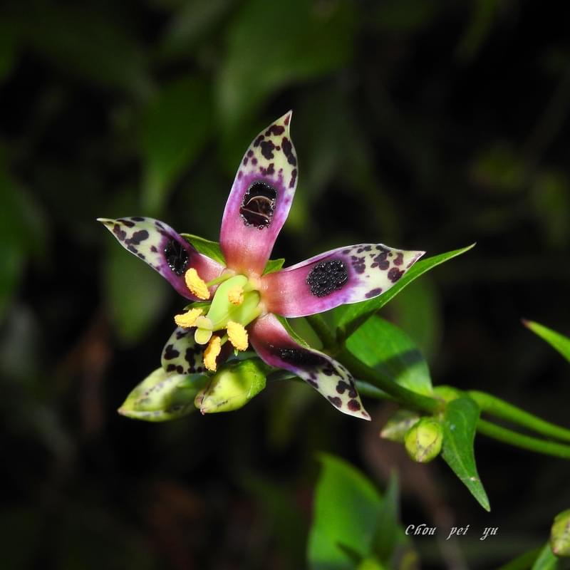 ![]() 上面照片:鄭演義拍攝 (花瓣5枚,淡黃綠色,散布紫斑,中間有一枚蜜腺(深紫色),可吸引昆蟲前來覓食;雄蕊5枚,雌蕊柱頭2叉) |