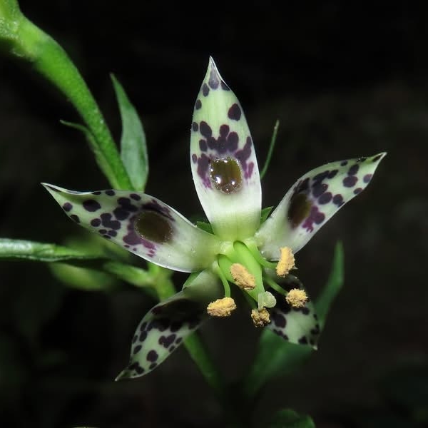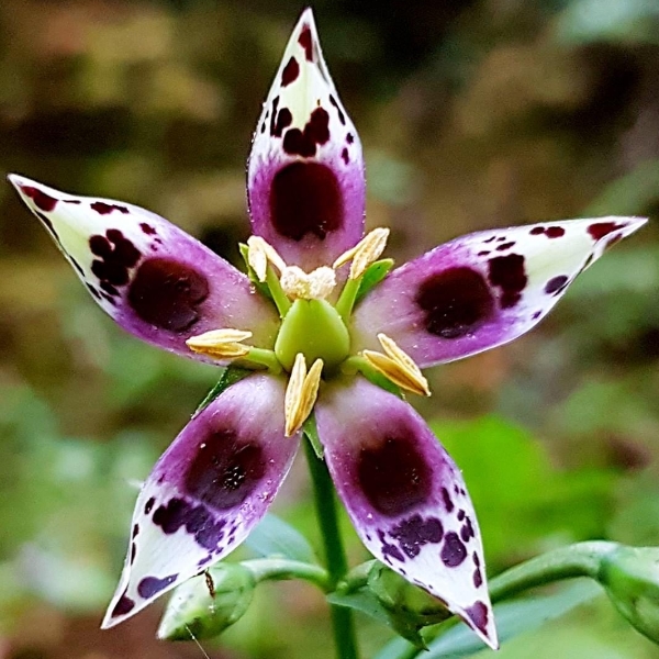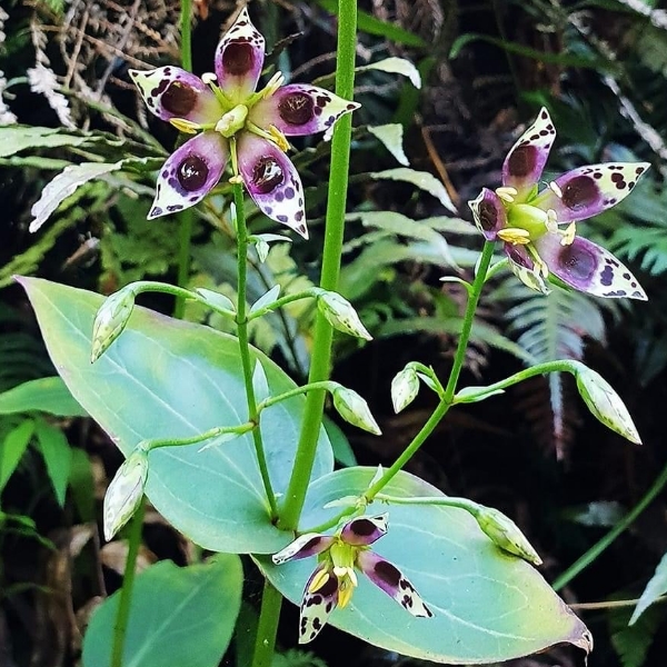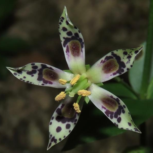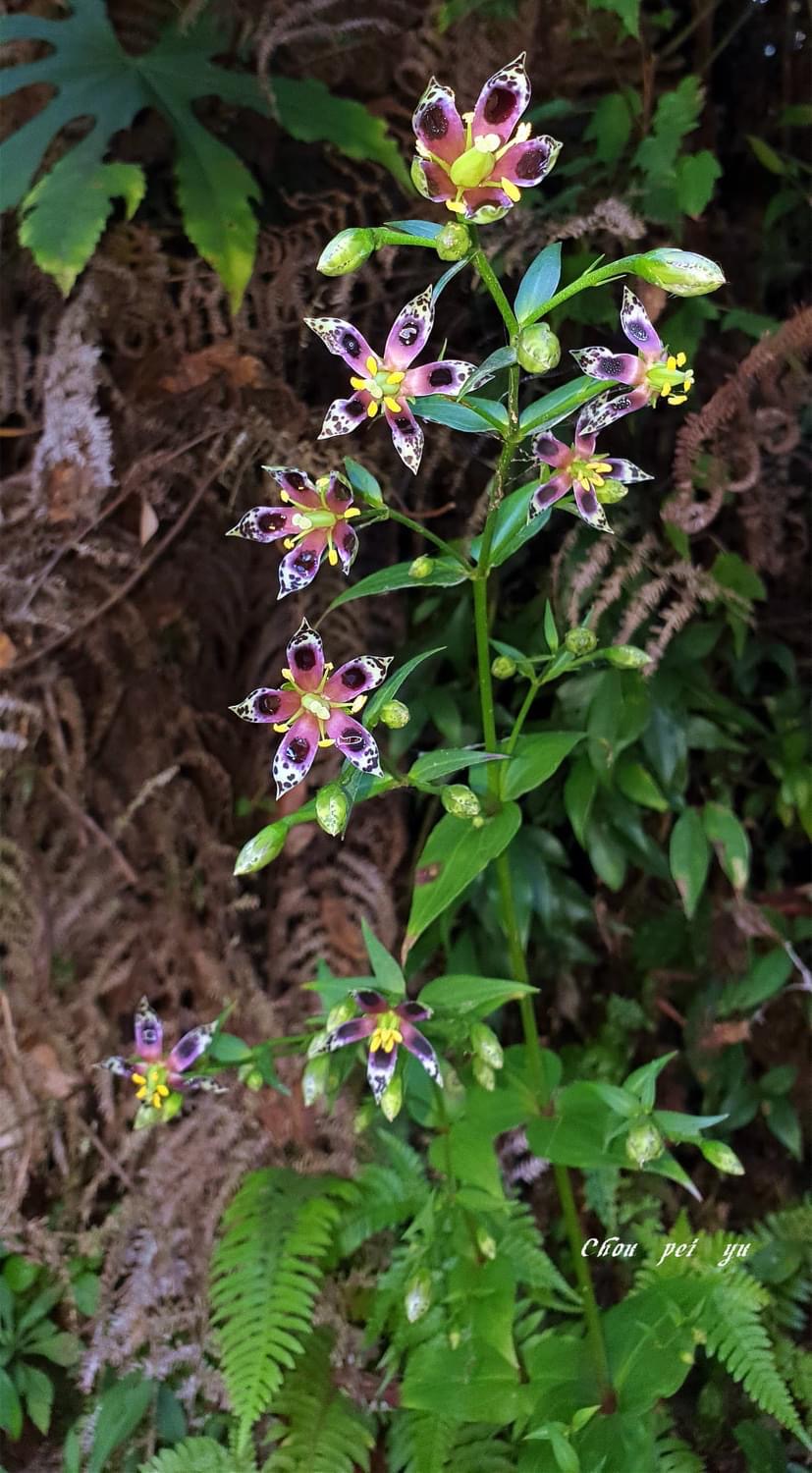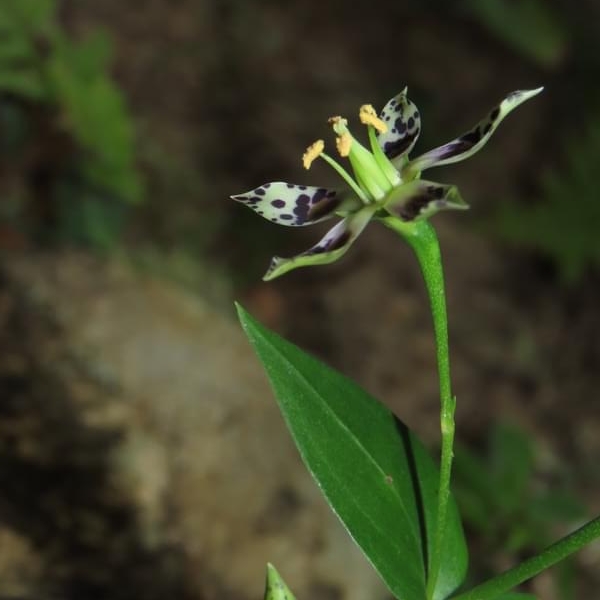 (原生種;原生於台灣、日本和中國大陸;台灣主要分布於新北市的新店山區;二年生草本;基生葉於開花時宿存,倒卵形至橢圓形;莖生葉,單葉對生,卵形,無柄;花朵單生或總狀花序,腋生;花瓣5枚,淡黃綠色,散布紫斑,中間有一枚蜜腺(深紫色),可吸引昆蟲前來覓食;雄蕊5枚,雌蕊柱頭2叉;蒴果長卵形形)